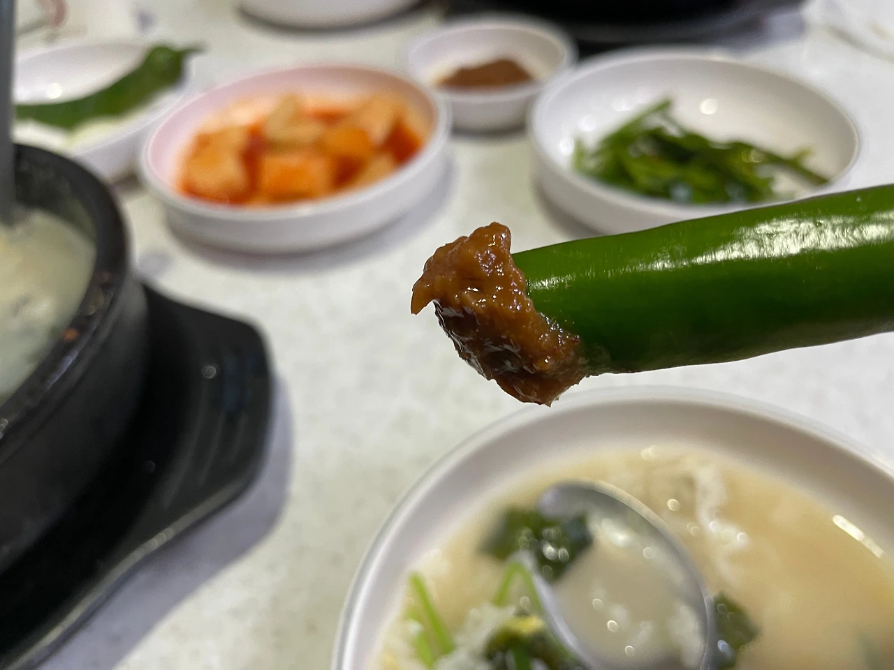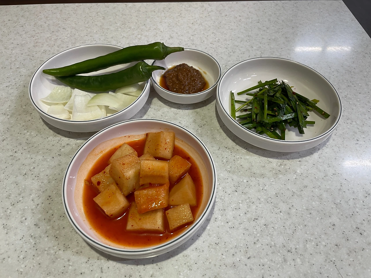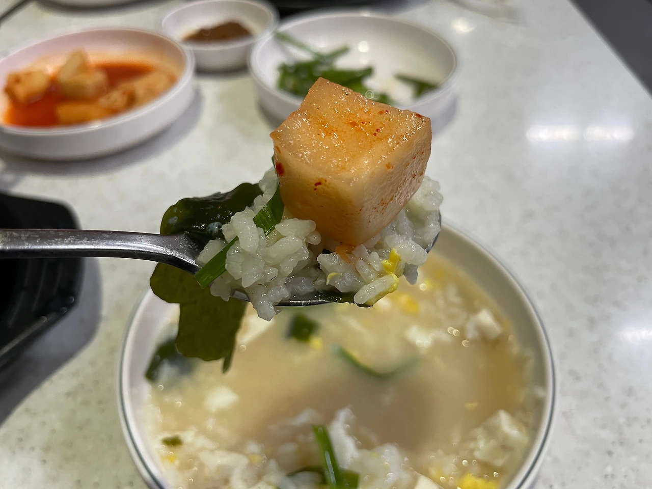 깍두기를 올려 먹어도 좋다. 미역, 굴 등 기본적으로 바다향이 진해서, 김치나 고추 같은 사이드가 꼭 필요하다.