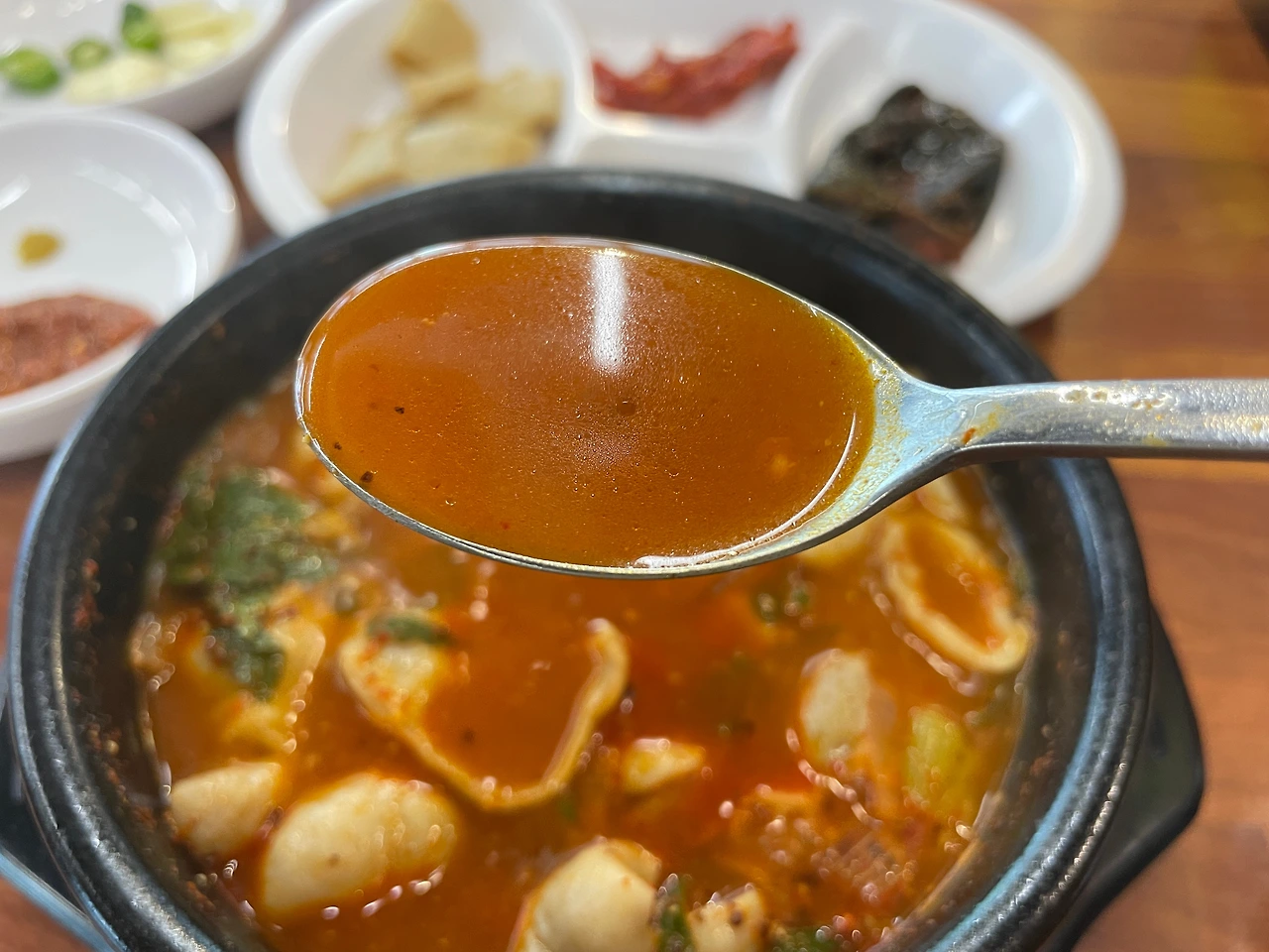 크으으. 맛있다. 진한 곱창전골 국물 같은 맛.