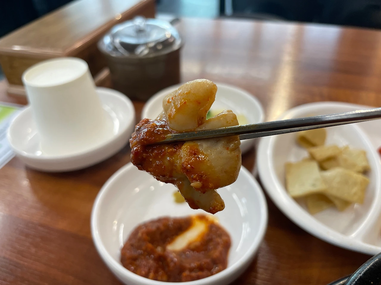 곱창을 특제 소스에 찍어 마늘과 함께 먹는다. 곱창이 살짝 느끼하던 참에 잘됐다. 알싸한 마늘이 든든한 지원군이 되어준다.