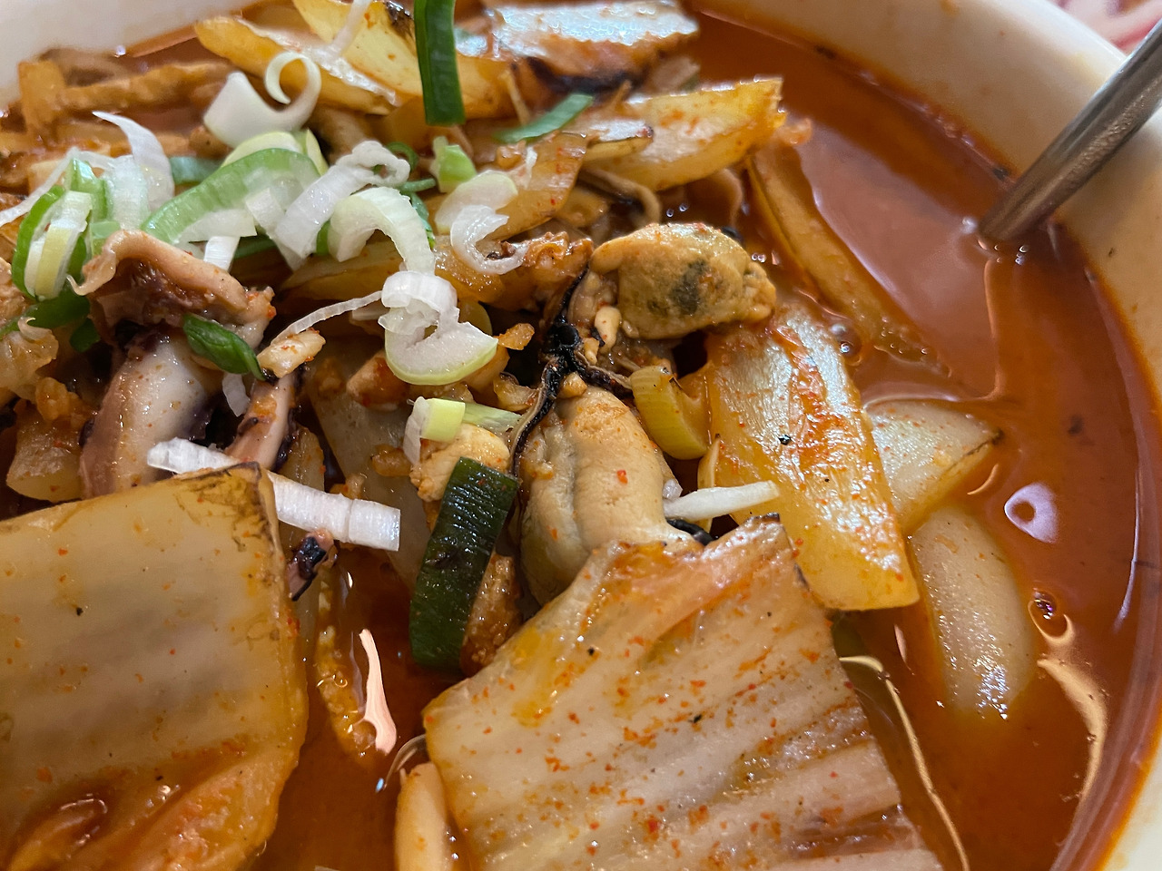 홍합 껍데기를 제거한 상태로 나와서 먹기 편하다. 각종 해산물이 듬뿍 들어있다.