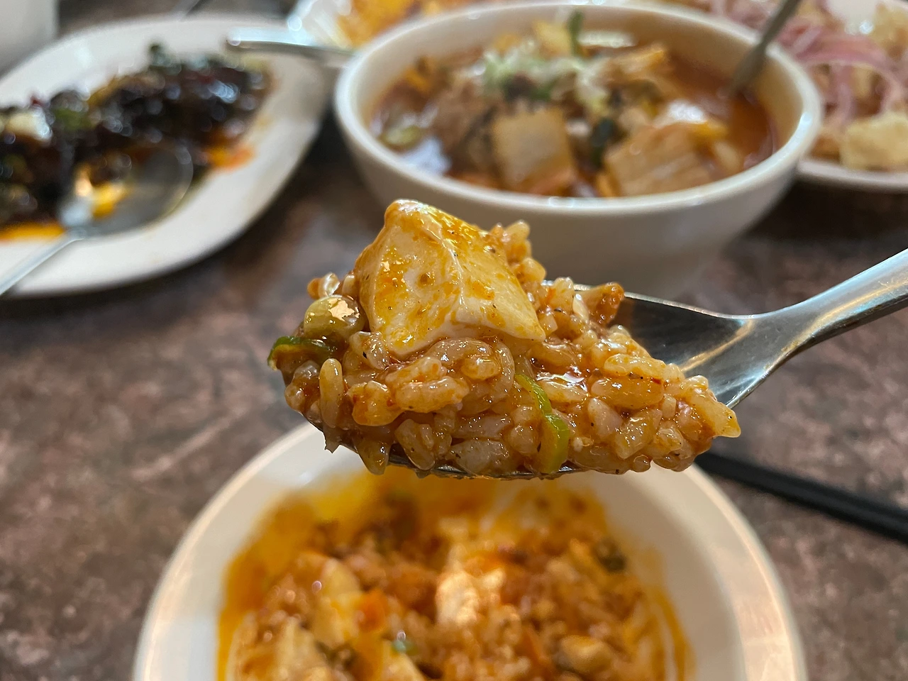 알싸하고 매콤한 양념과 부드러운 두부가 흰쌀밥의 달콤함과 조화를 이루어 훌륭한 맛을 선사한다.