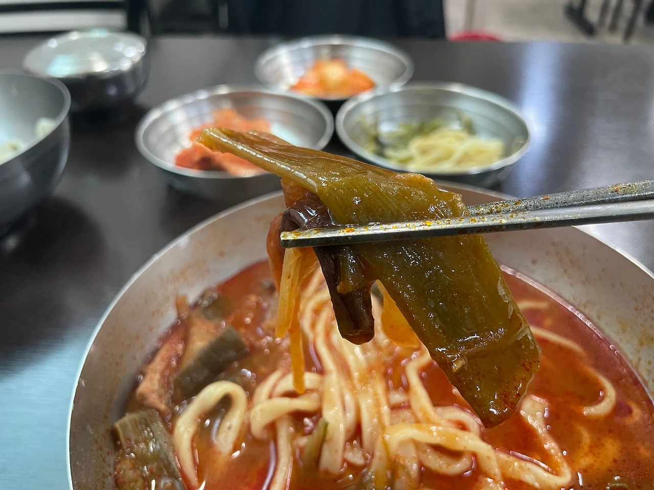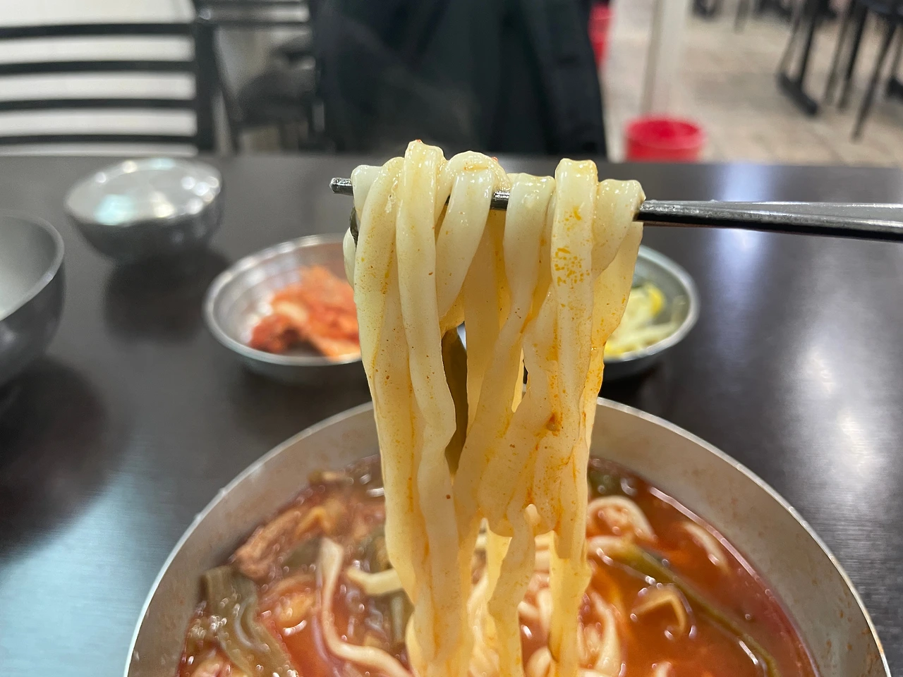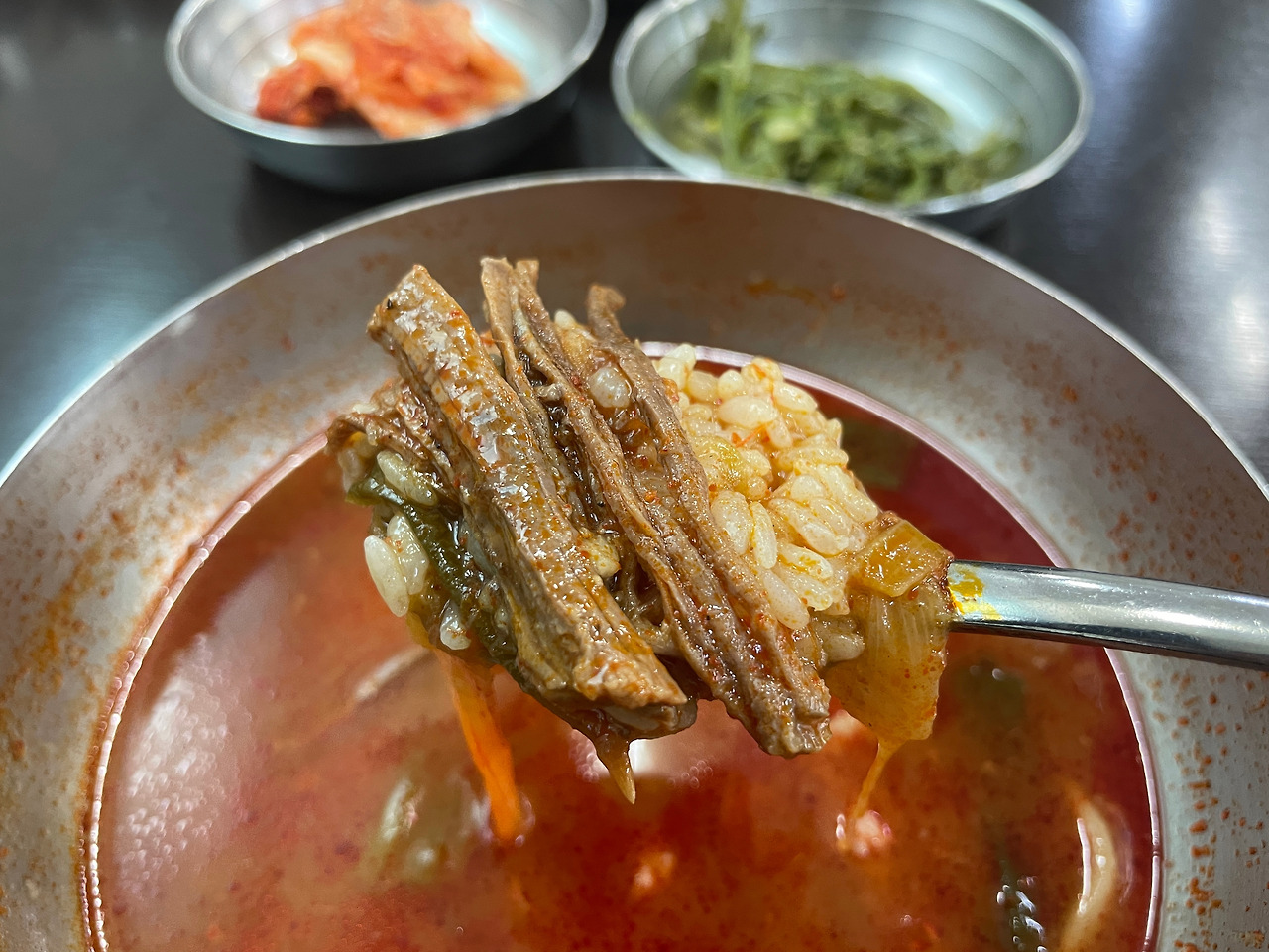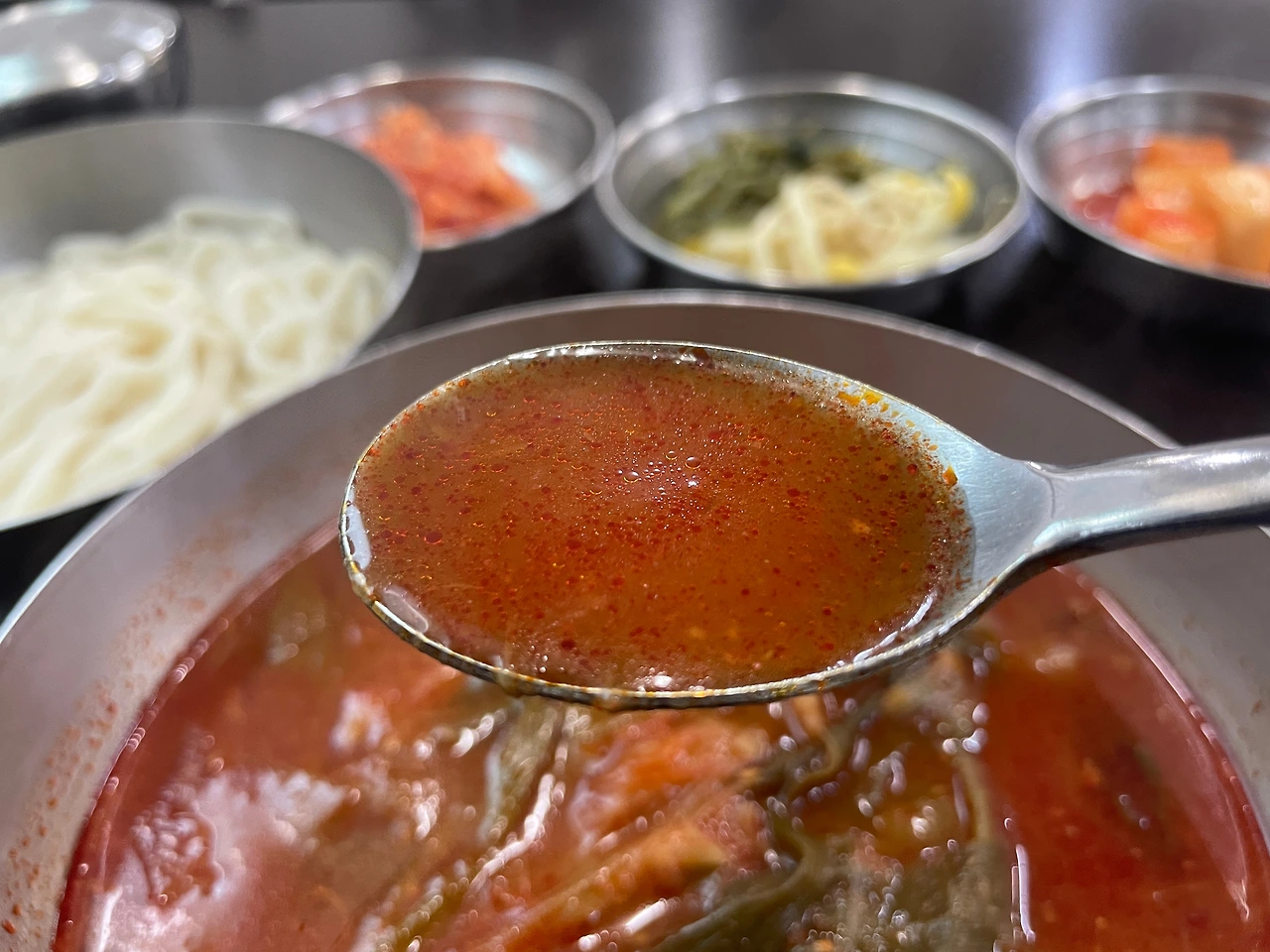 육개장에 들어가는 대파의 알맞은 익힘 정도, 거기에 이븐하게 삶아진 면의 탄력이 더해지면 최상의 조합이 탄생한다. 죽처럼 퍼지지 않도록 타이트하게 끓여진 육개장 칼국수의 환상적인 맛. (네, 맞아요, 요새 흑백요리사 열심히 보고 있습니다ㅋㅋ 진짜 재밌네요.)
