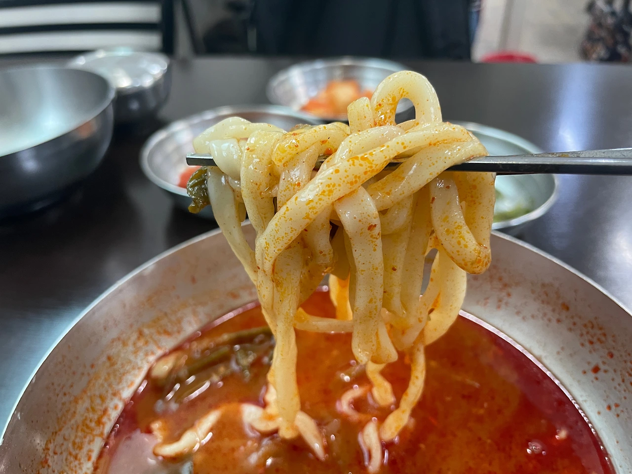 면은 쫄깃한 쪽이다. 한 번에 다 넣지 말고 두 번에 나눠 넣자. 그래야 국물이 자작하게 먹을 수 있다.