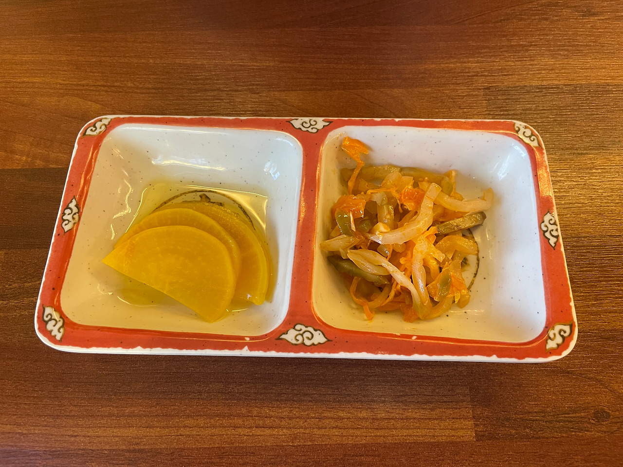 단무지와 쨔사이 무침이 기본 반찬으로 제공된다.