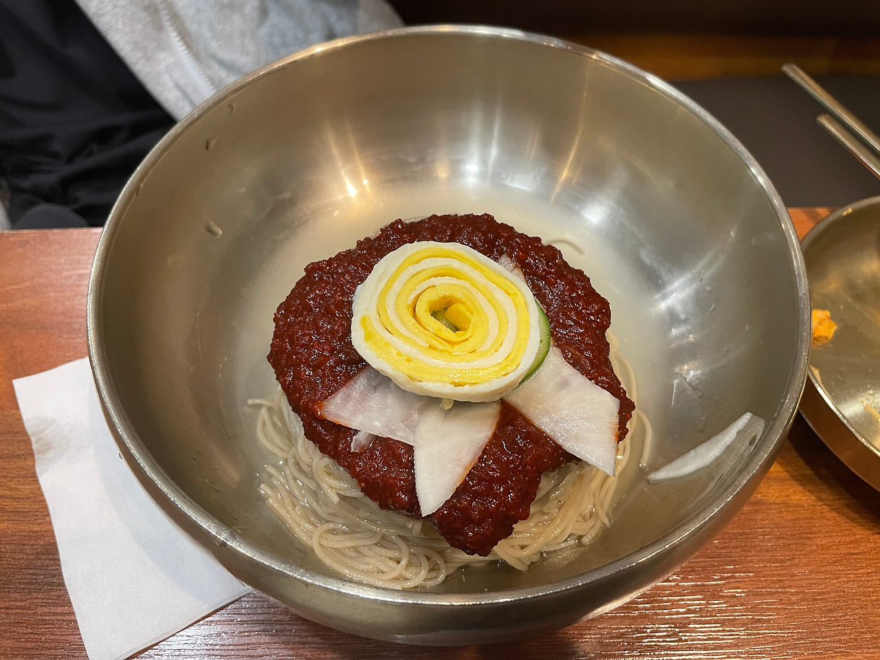 매콤한 비빔냉면 맛을 기대했는데, 웬걸. 안 맵다.