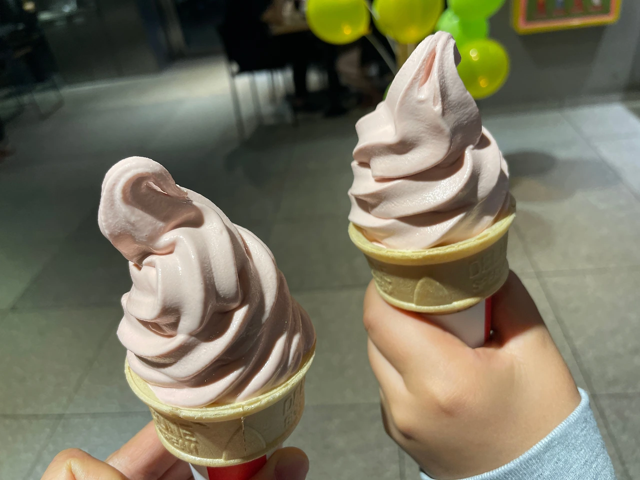 아들과 집에 오다가 맥도널드에서 딸기소프트콘을 하나씩 사서 먹었다.