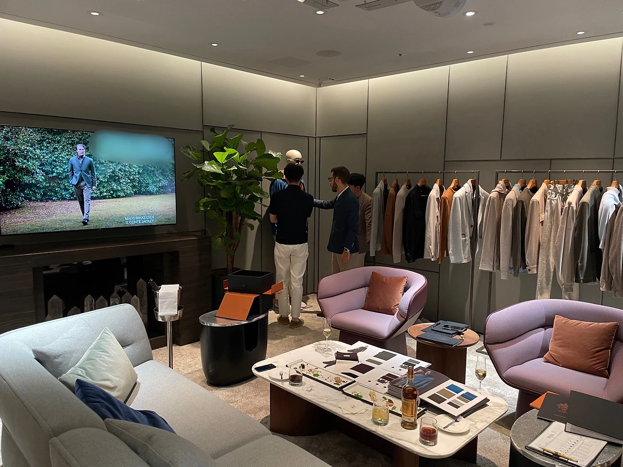 편안한 분위기의 실내에 안락한 소파와 세련된 테이블이 놓였다. 그 위에 맞춤을 위한 카탈로그 들과 원단 샘플들이 준비되어 있다. 그리고 한쪽에는 신상품과, 국내 매장에서 쉽게 볼 수 없는 제품들이 옷걸이에 가지런하게 걸려있다. 전체적으로 따뜻하고 안정적인 톤이다.