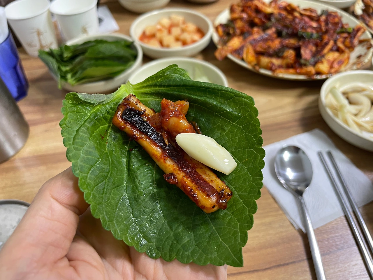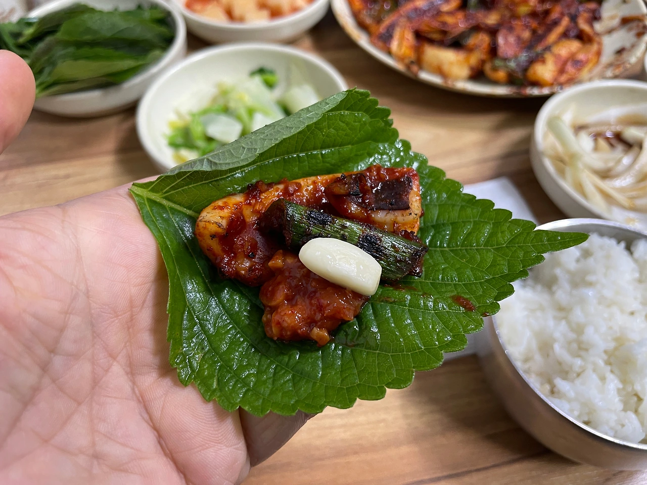 깻잎에 싸서, 마늘과 쌈장을 넣고 먹으니 불향과 깻잎향이 어우러져 코가 즐겁다. 맛있구나.