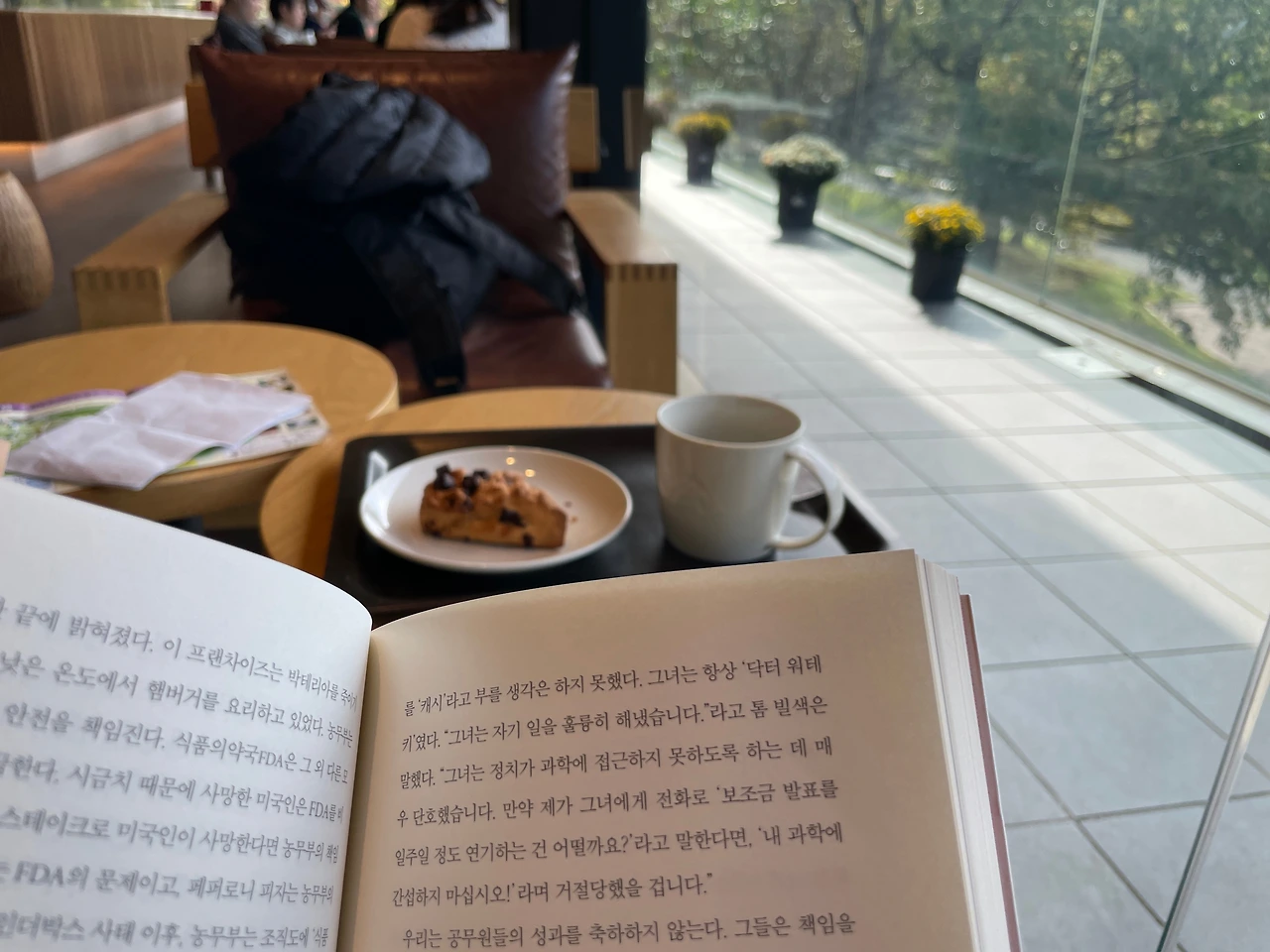 빵 하나와 따뜻한 커피를 들고 창가에 앉았다.