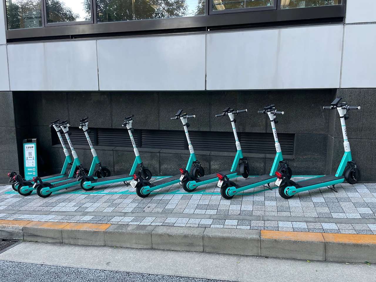 나란히 각 맞춰 주차해 놓은 공유 킥보드.