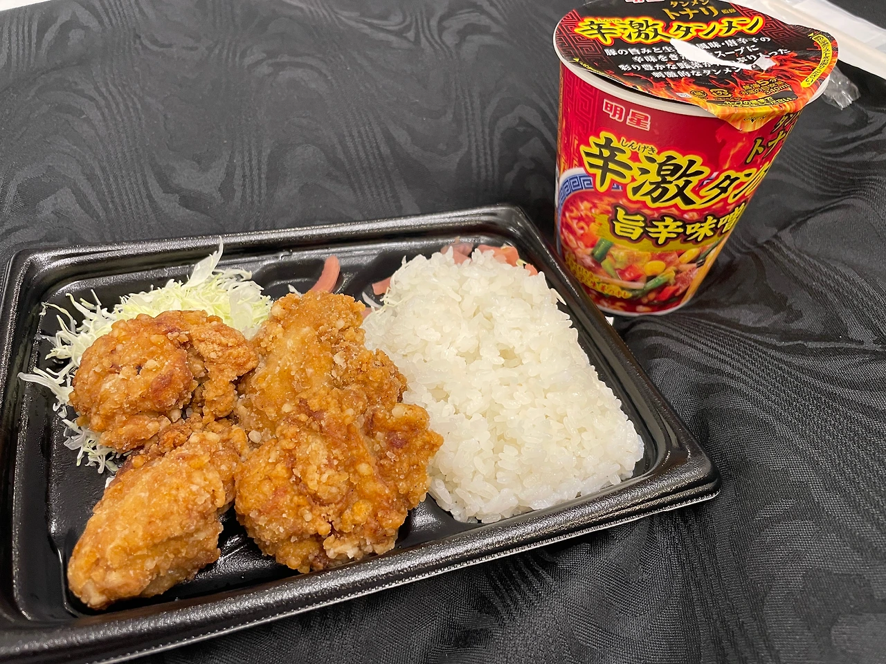 편의점에서 도시락을 사 왔다. 가라아게 도시락이었나. 암튼 거기에 매콤해 보이는 컵라면 하나.