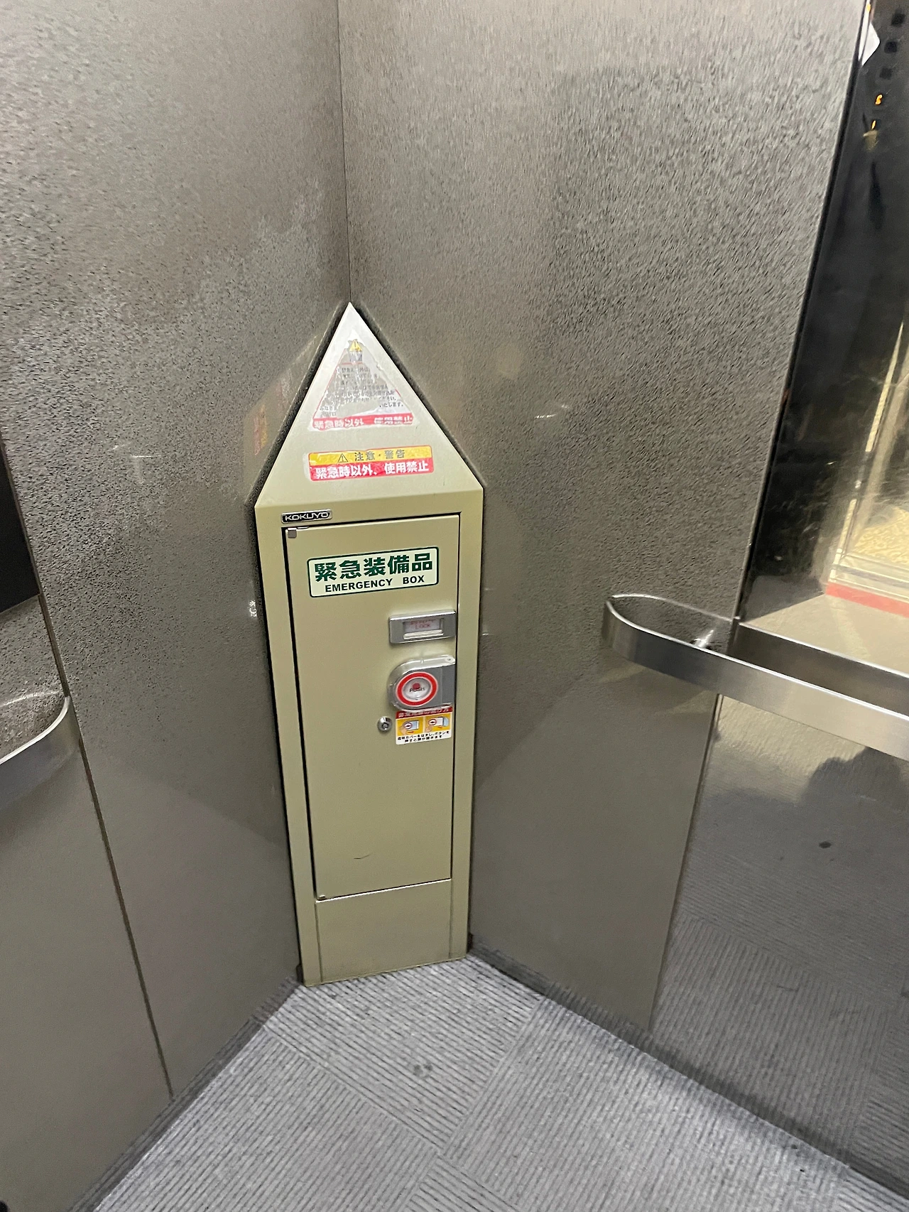 엘리베이터를 타니 아래와 같은 구조물이 구석에 있다. 일본은 지진을 대비한 물건들을 이렇게 엘리베이터에 비치해 놓는다. 지진에 대한 그들의 공포가 느껴진다.