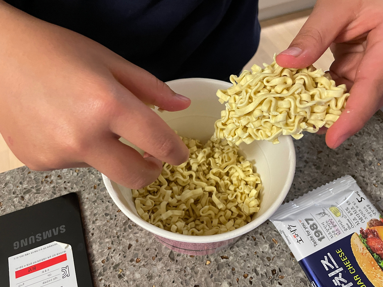 ① 까르보나라 불닭 뚜껑을 열어서 스프를 꺼내 옆에 놓고, 면을 잘게 부순다.
