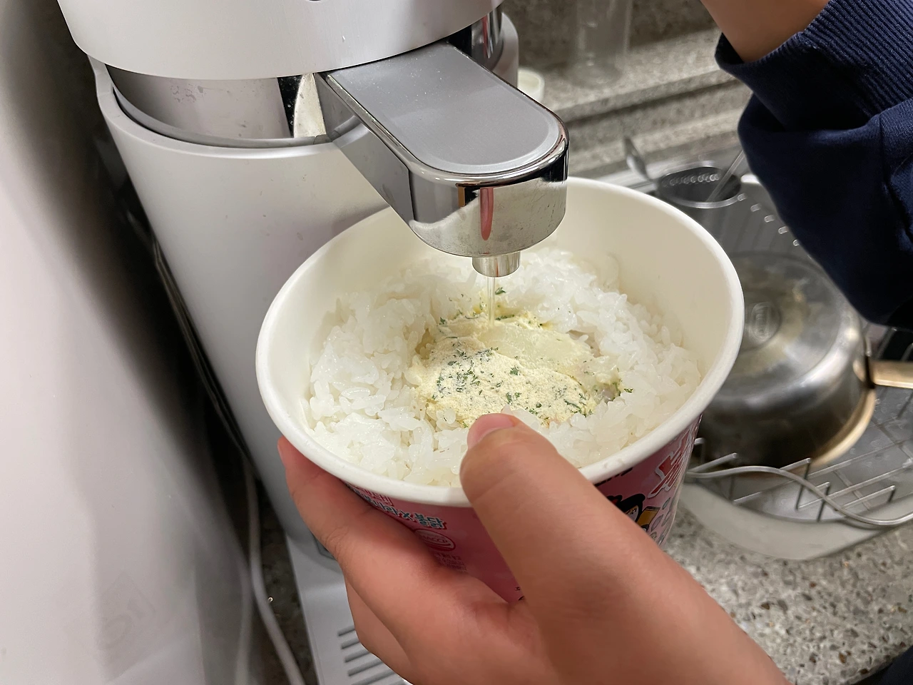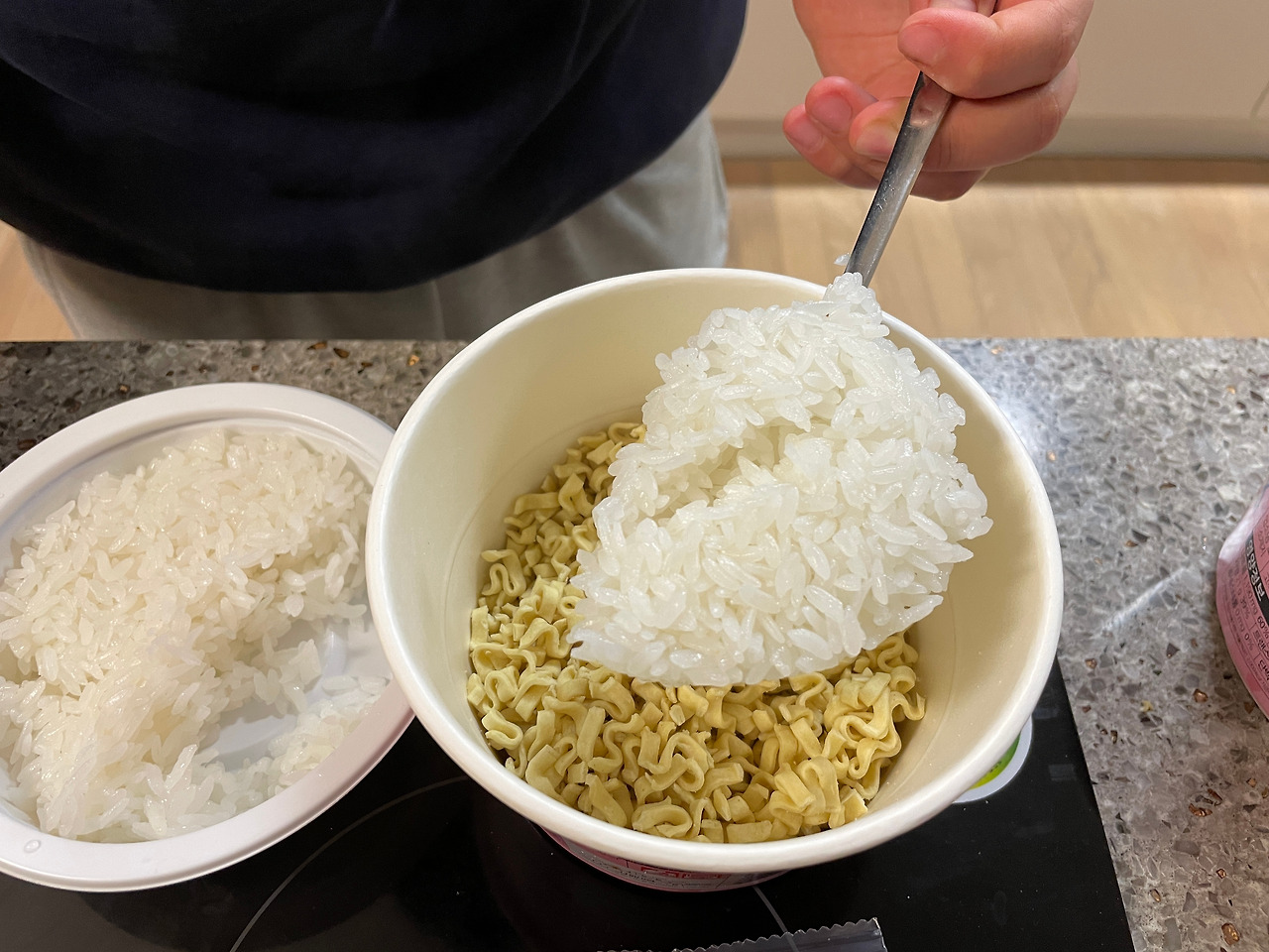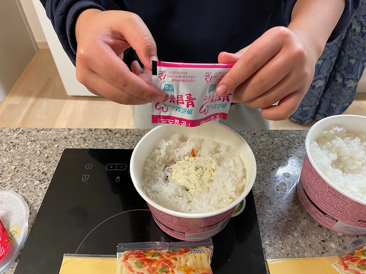 ② 잘게 부순 면 위에, 햇반을 하나 넣는다.
