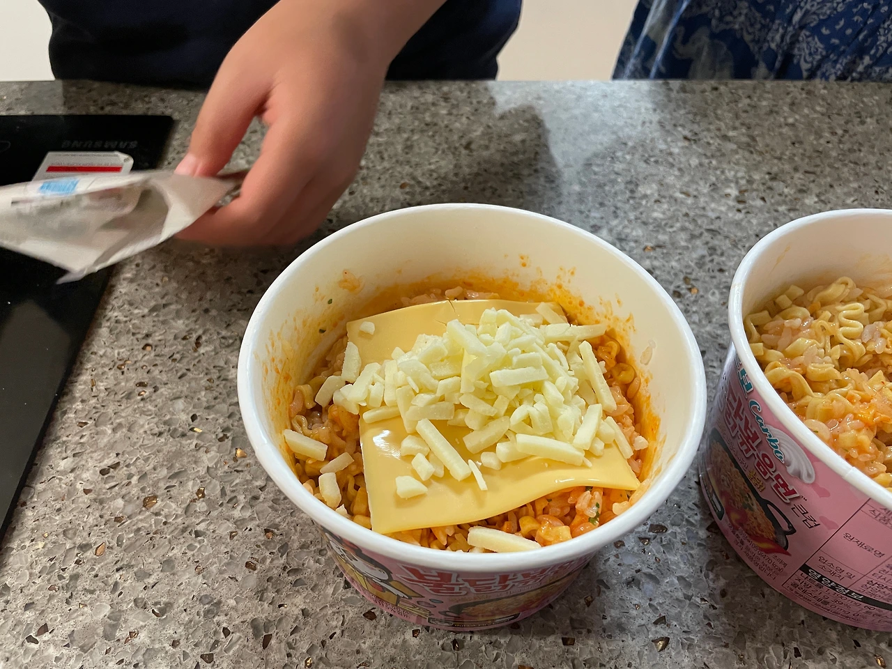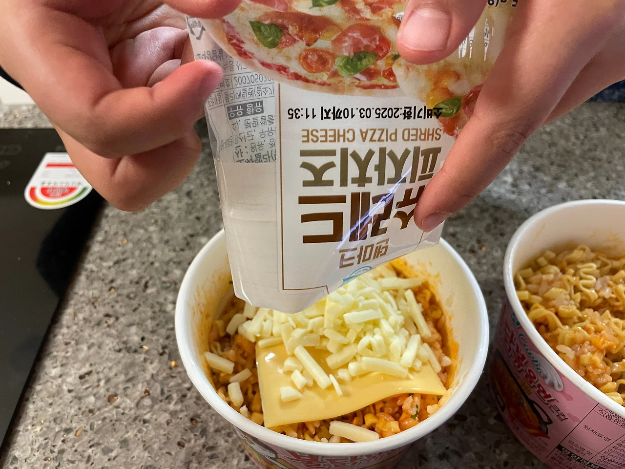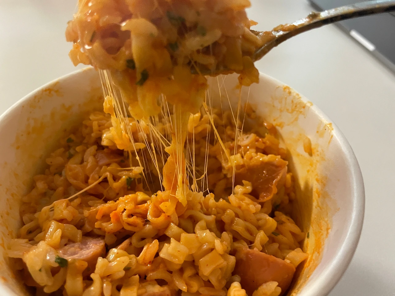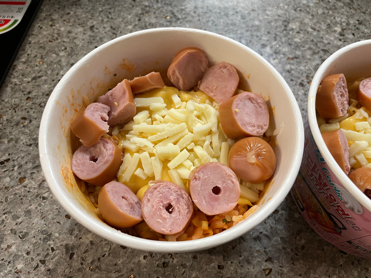 까르보불닭볶음면, 햇반, 체다 치즈, 모짜렐라 치즈, 핫바.