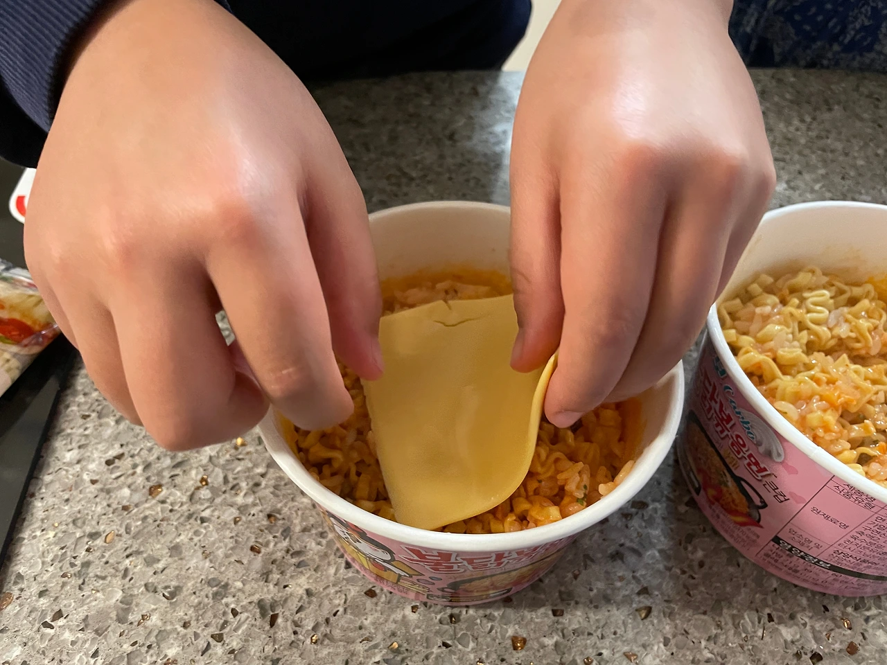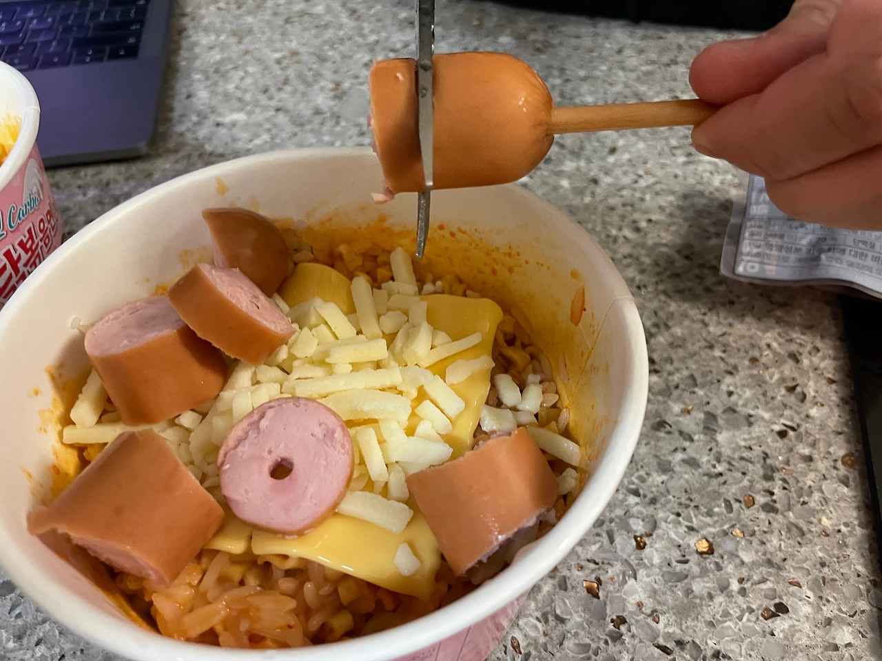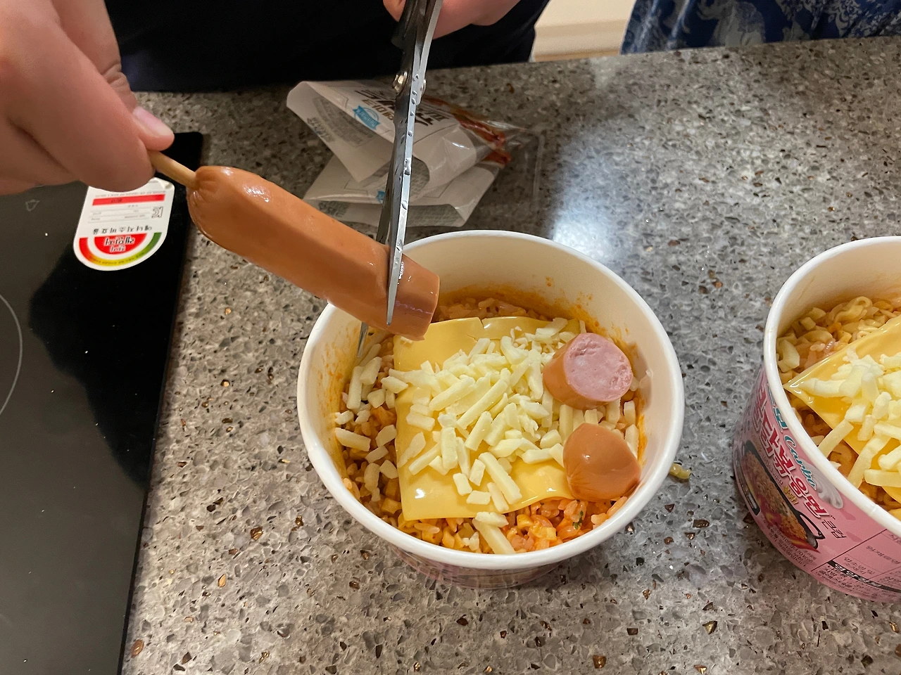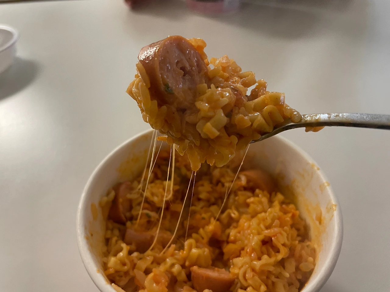 까르보불닭볶음면, 햇반, 체다 치즈, 모짜렐라 치즈, 핫바.