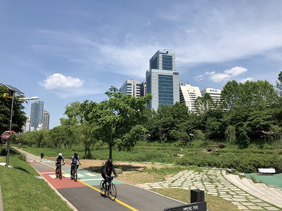 횡단보도를 찾아서 건넜다. 두세 발자국이면 자전거 도로를 지나 보행자길로 들어간다.