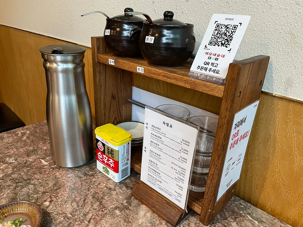 양념과 물컵 등이 나무로 된 보관대애 정갈하게 놓여있다. 깔끔하다. 먼지하나 없다. 이런 디테일에서 정성이 느껴진다. 어쩐지 이 집, 느낌이 좋다.