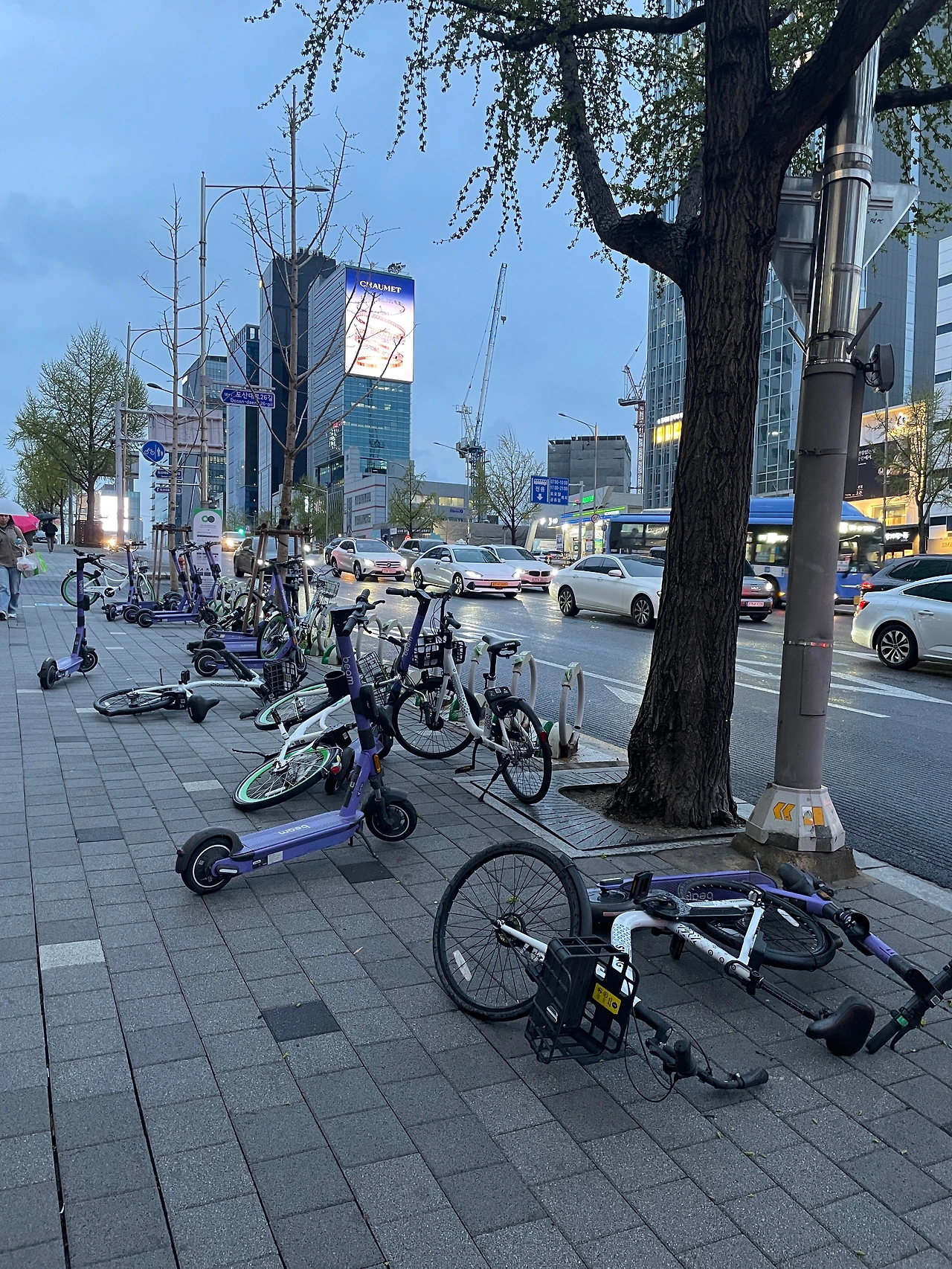 혼란하다. 저렇게 자전거와 킥보드를 바닥에 던져 쓰러뜨려 놓는 인간의 심리는 무엇일까. 기본적인 예절이나 공중도덕에 대한 교육이 부족한 탓일까.