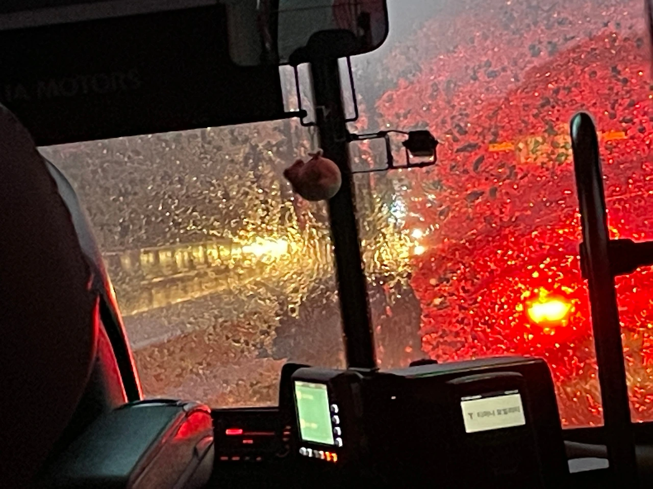 앞을 보니 폭우가 차 앞유리를 때리고 있었다.
