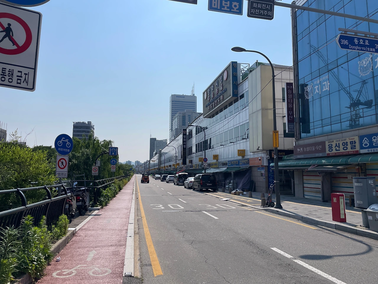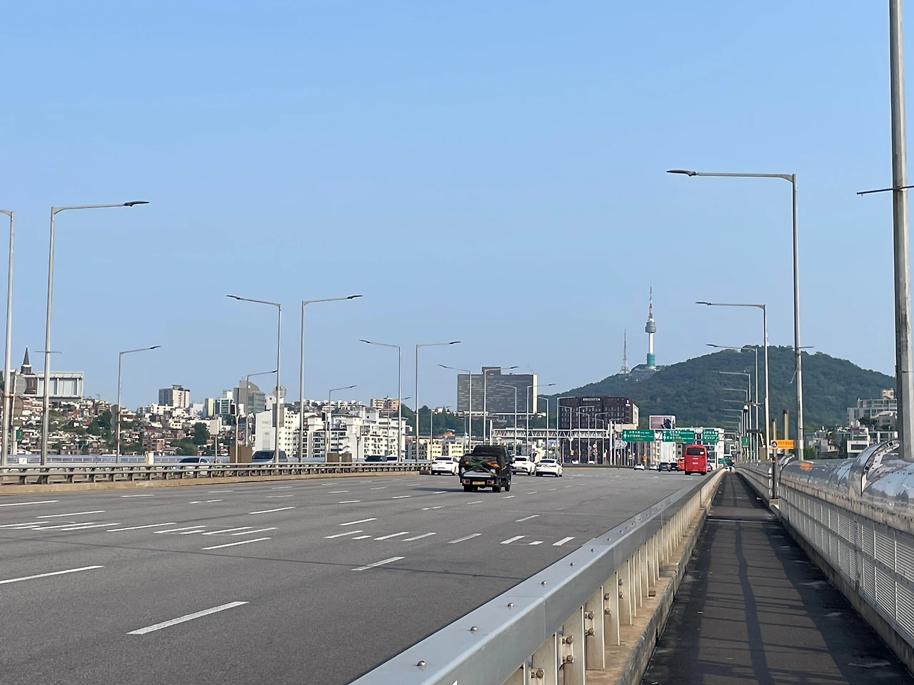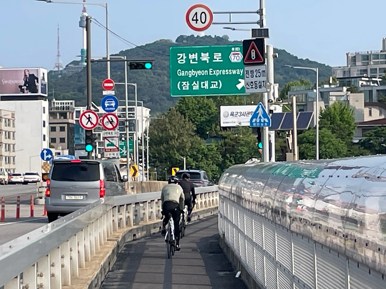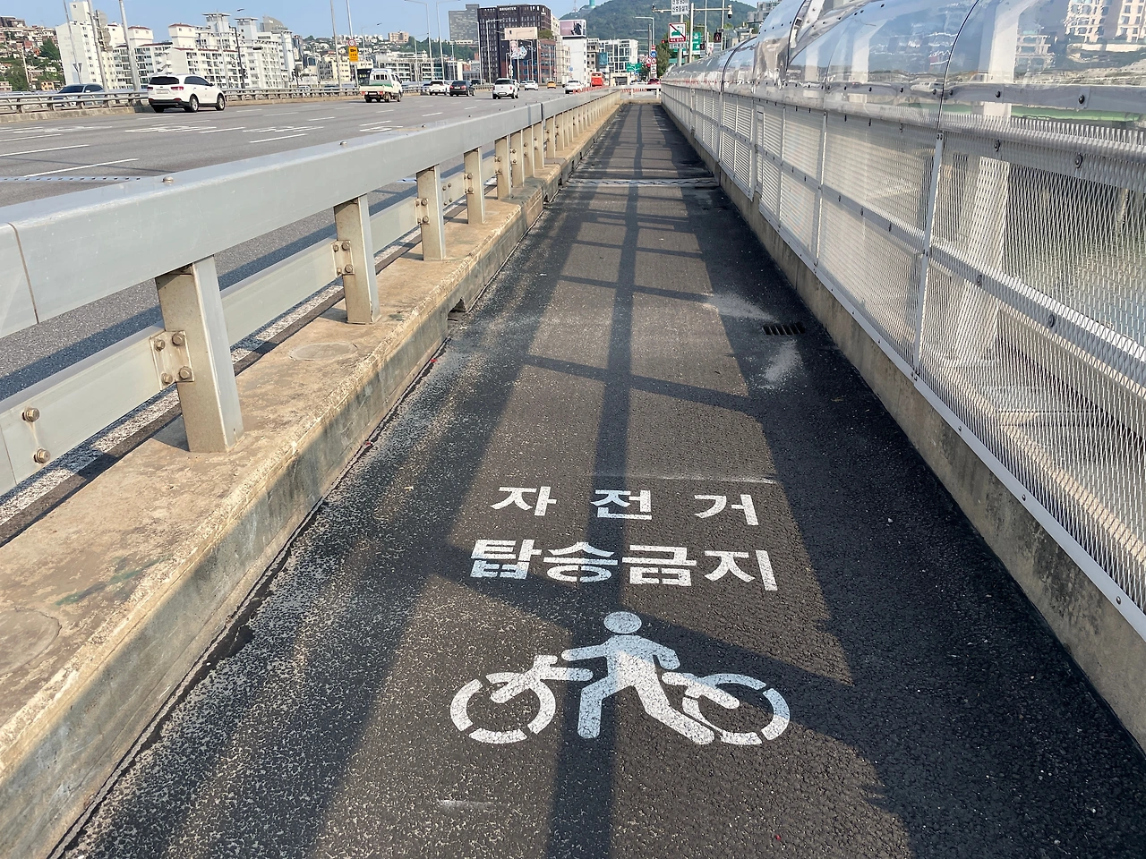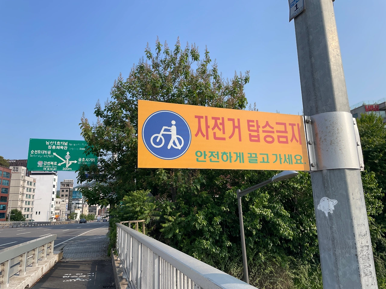 한남대교를 건널 때는 자전거 탑승 금지다. 자전거에서 내린 후, 끌고 걸어서 다리를 건너야 한다. 보행자의 안전을 위해서다. 그래서 아래와 같은 안내가 곳곳에 표시되어 있다.