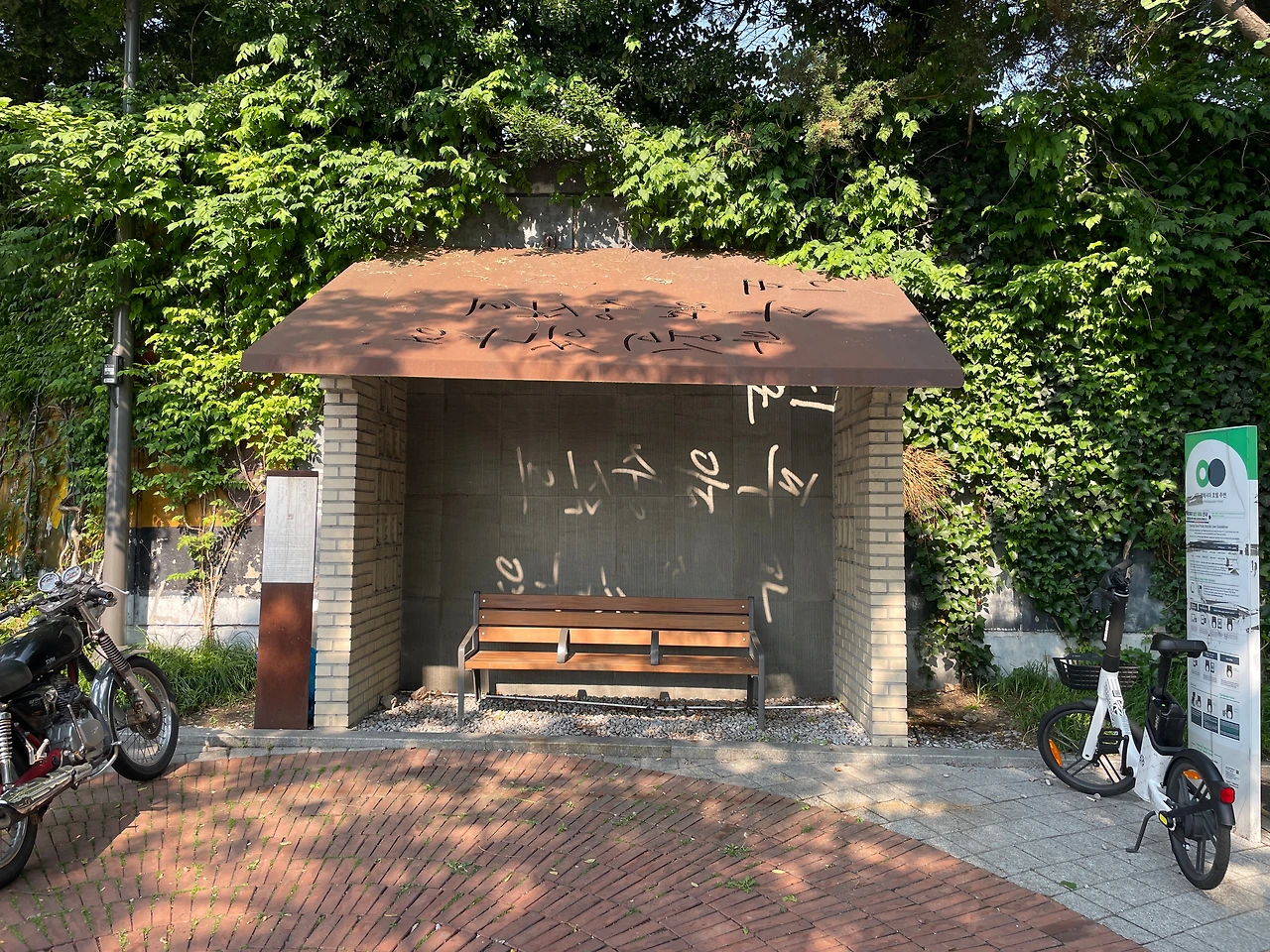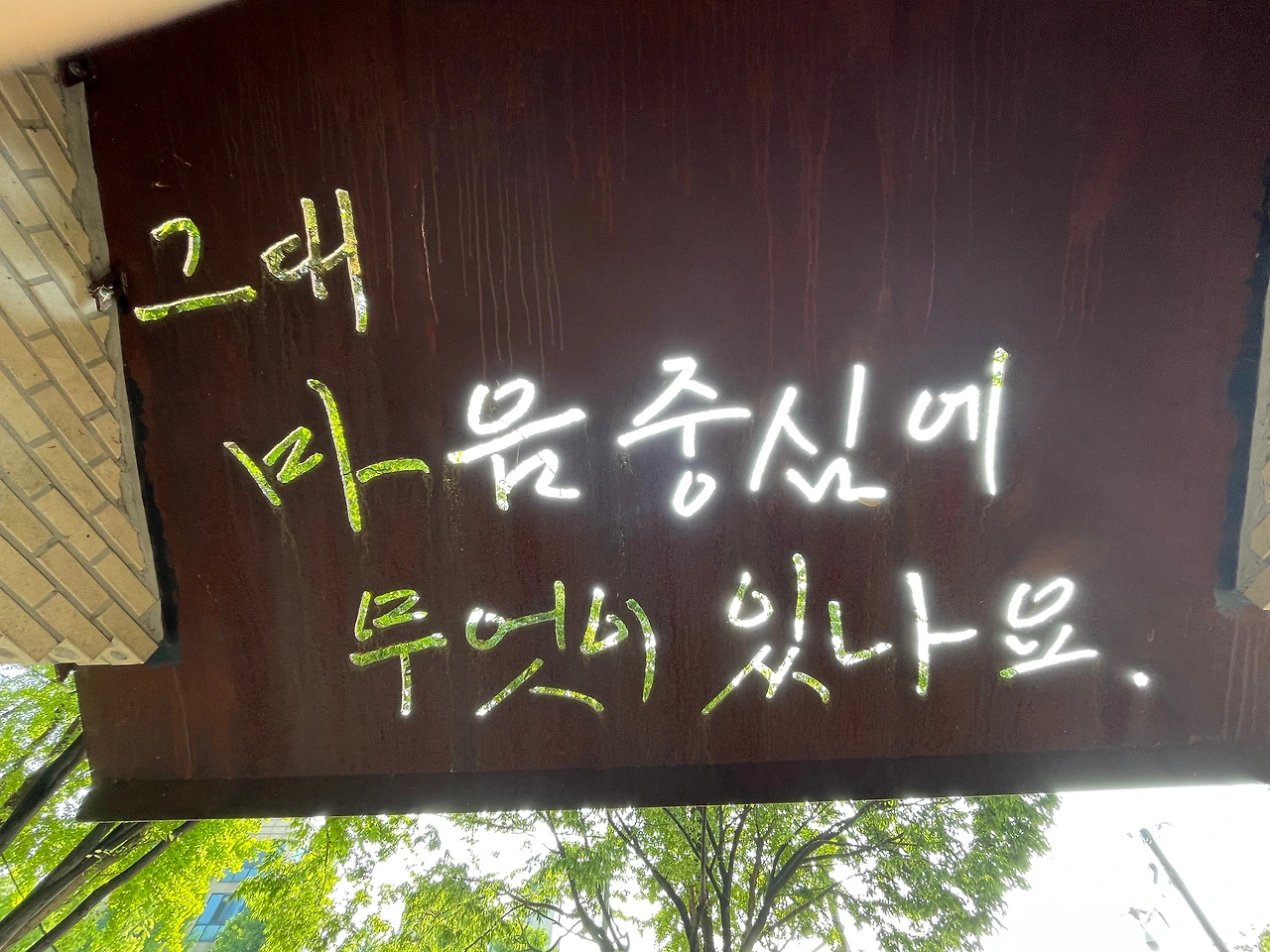 지나가다 묘한 벤치가 있어서 가까이 가봤다. 햇빛이 천장에 뚫린 구멍들을 지나 벽에 글씨를 만들고 있었다. 궁금했다. 가서 벤치에 앉아 하늘을 보니, 이런 글귀가 보였다.