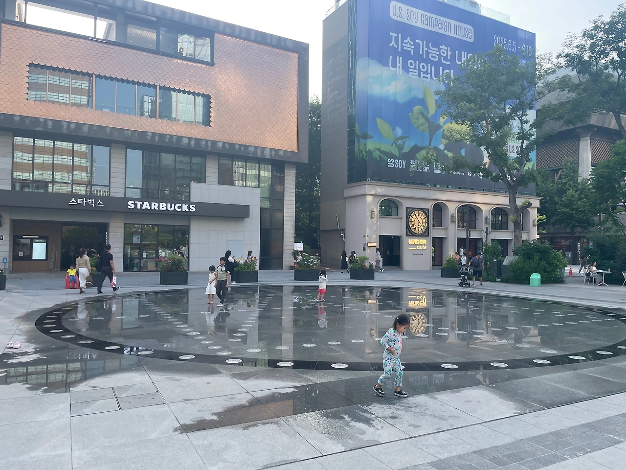 아이들이 분수 광장에서 즐겁게 뛰어논다.