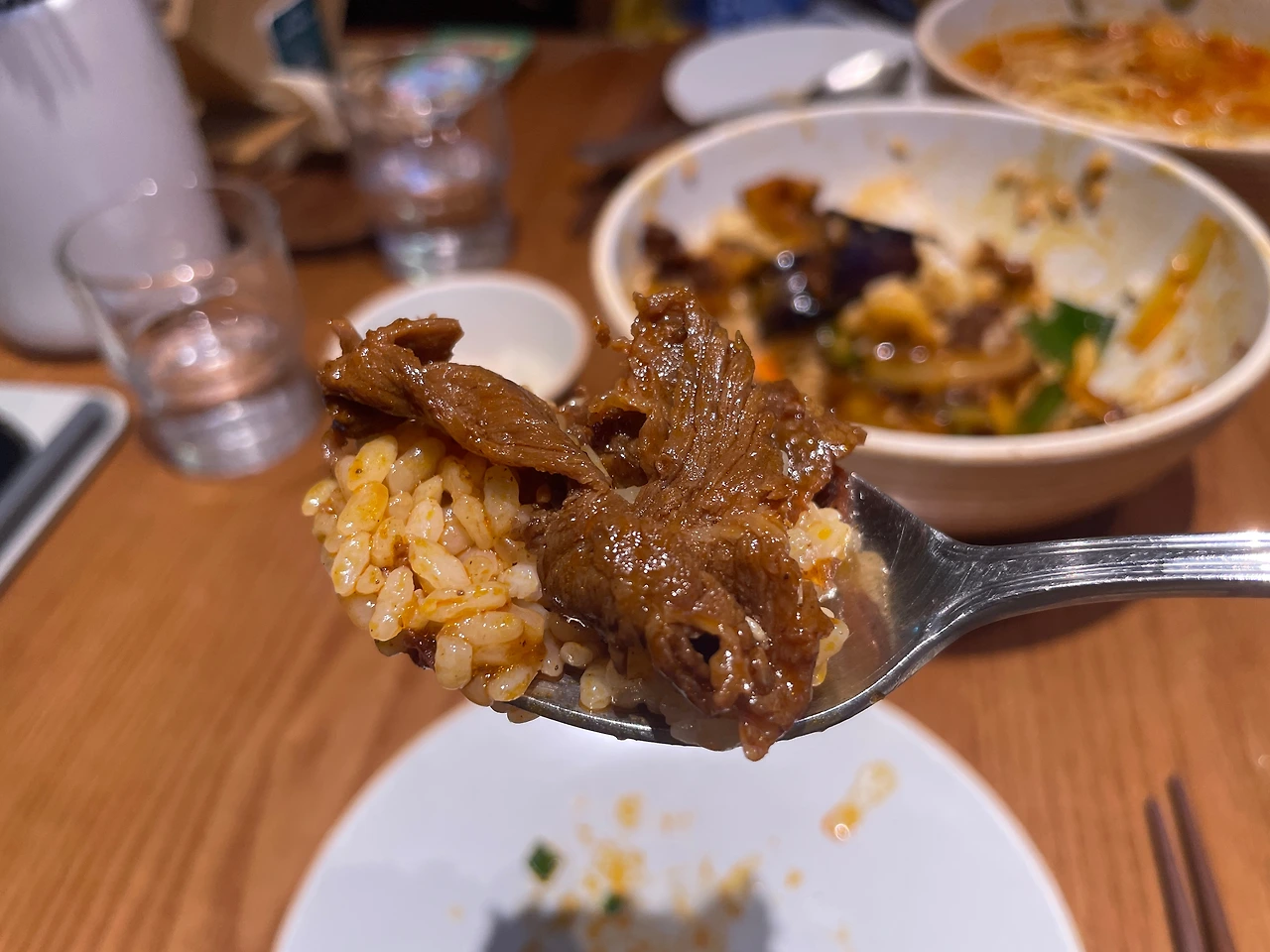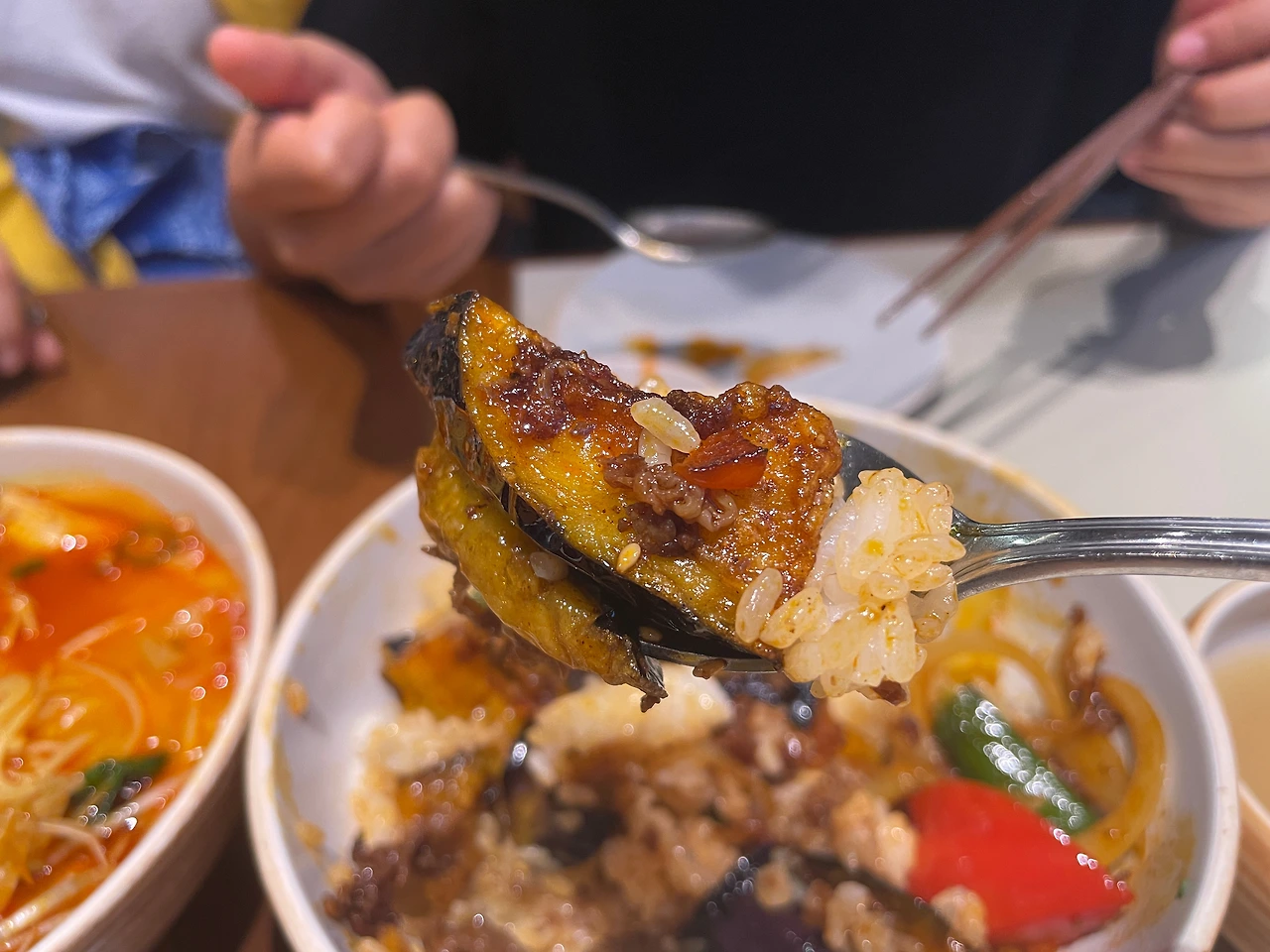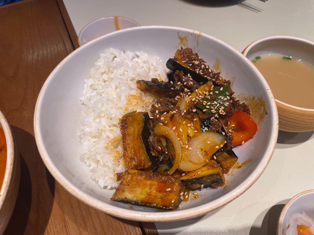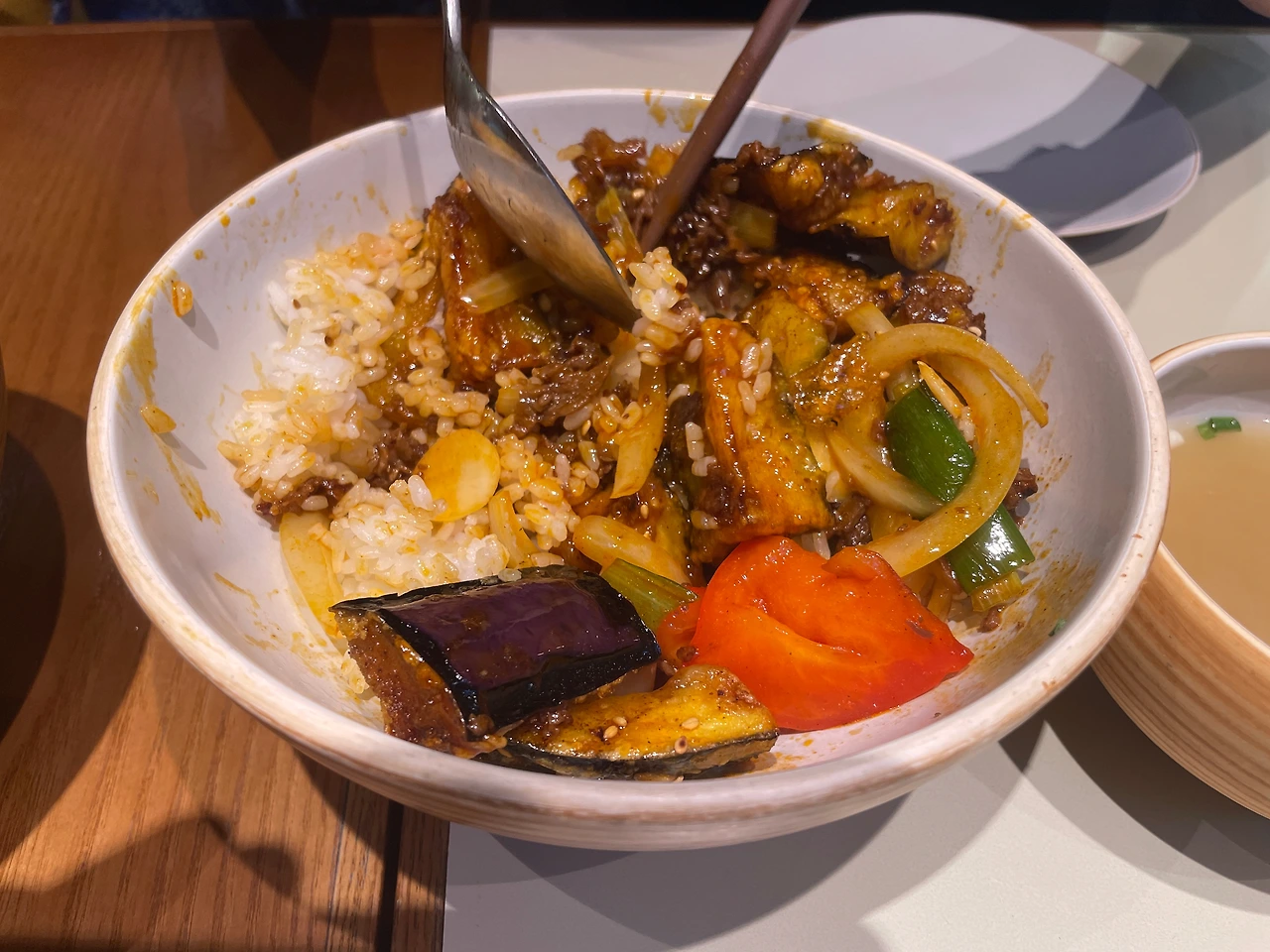달콤 짭짜름한 소스와 가지, 소고기, 흰 밥의 조화가 좋다.