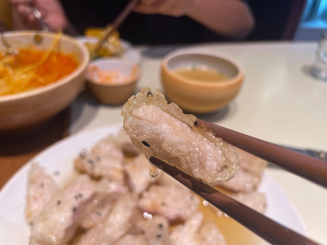 찹쌀반죽과 고기를 같이 씹으니 달콤하다.