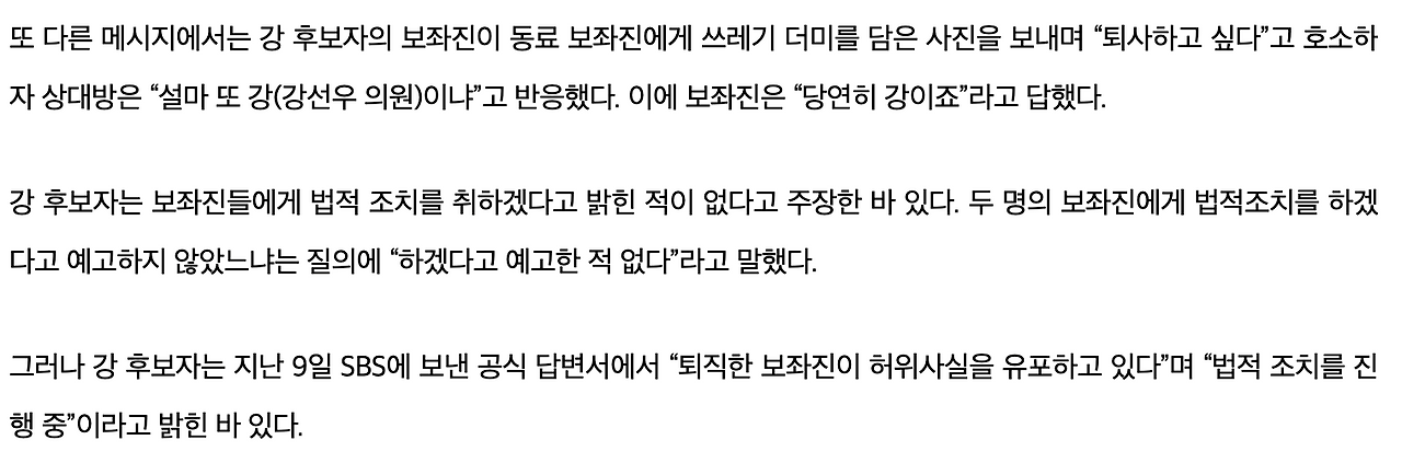 이삿짐을 옮기는 것에 대해 지시했냐는 질문에 대해서도 강의원은 "자발적으로 도와준 것이다"라고 했지만, 보좌진 복수의 증언을 통해 동원의 정황이 드러났다.