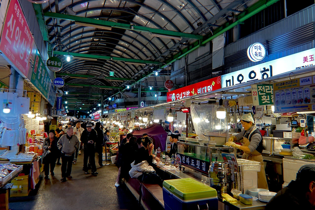 고소한 기름 냄새를 풍기는 빈대떡 파는 가게부터 김이 모락모락 나는 손칼국수집까지. 다양한 가게들이 있다. 맛있는 유혹들이 사방에 널려 있다.