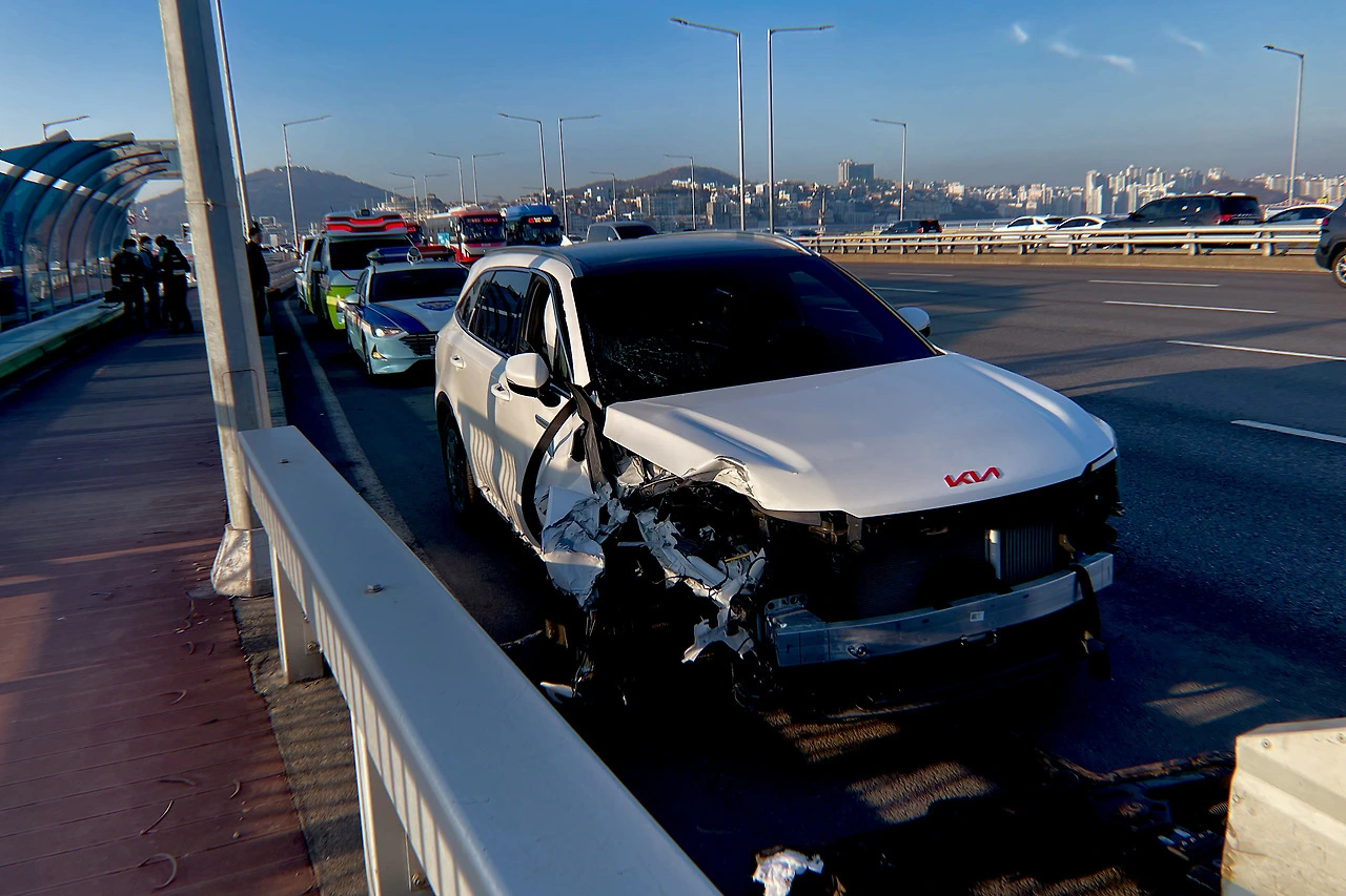 저 멀리 경광등을 켠 경찰차와 구급차, 견인차가 엉겨 있다. 한남대교 위에서 사고가 난 모양이다. 평화로운 풍경 속에 긴장감이 감돈다.