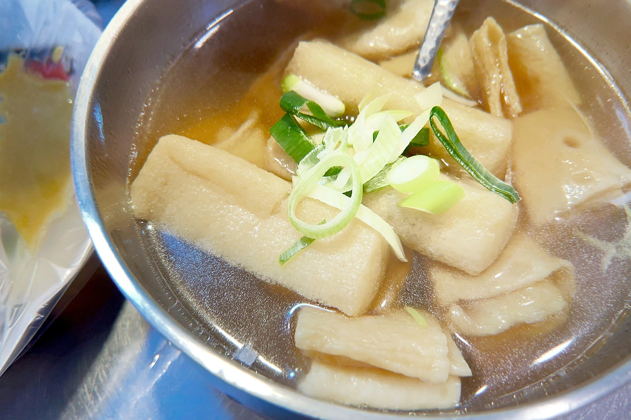 땀이 식으며 살짝 한기가 돌던 차에 뜨끈한 오뎅 국물이 반갑다. 뜨끈한 오뎅국물 맛은, 말해 뭐 하랴. 훌륭하다. 큼직한 유부가 고명으로 올라가 있는 게 특이하다.