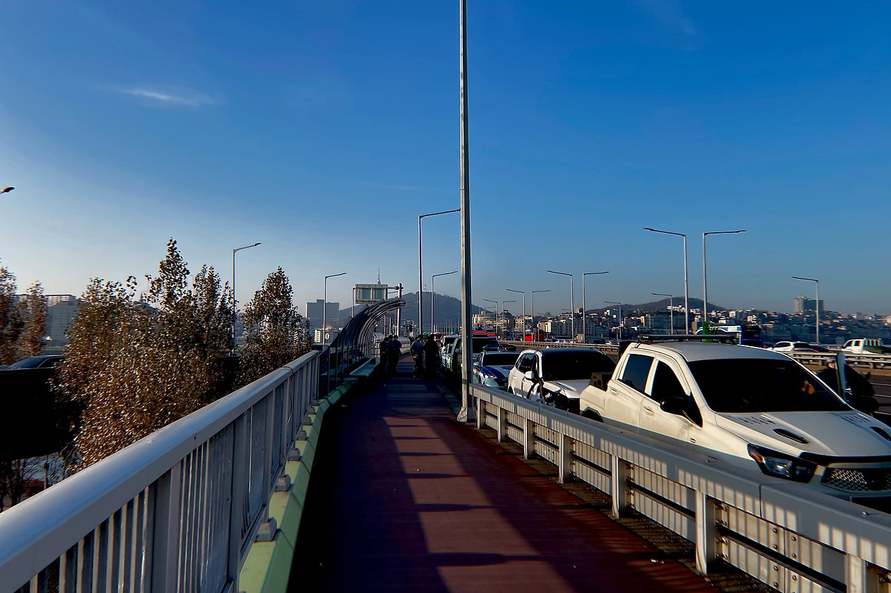 다리 아래로 내려다보이는 올림픽대로. 오늘도 역시 차들로 빼곡하다. 끊임없이 이어지는 자동차들의 행렬이 서울이라는 거대 도시를 움직이는 혈관 같다.