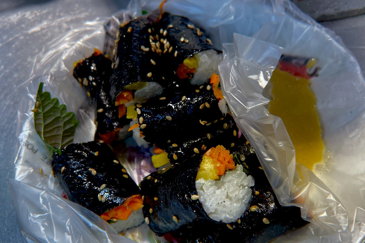 김밥 옆에 놓인 노란 소스를 찍어 먹어보니 맛이 독특하다. 예전에 '마약김밥'이라는 이름으로 명성을 떨치게 했던 바로 그 겨자 소스인가 보다. (지금은, 식품에 '마약'관련 명칭 사용이 금지되어서 아마 '마약김밥'이라는 메뉴명은 못쓰는 걸로 알고 있다.) 톡 쏘는 새콤달콤함이 평범한 꼬마 김밥을 특별하게 만들어준다.