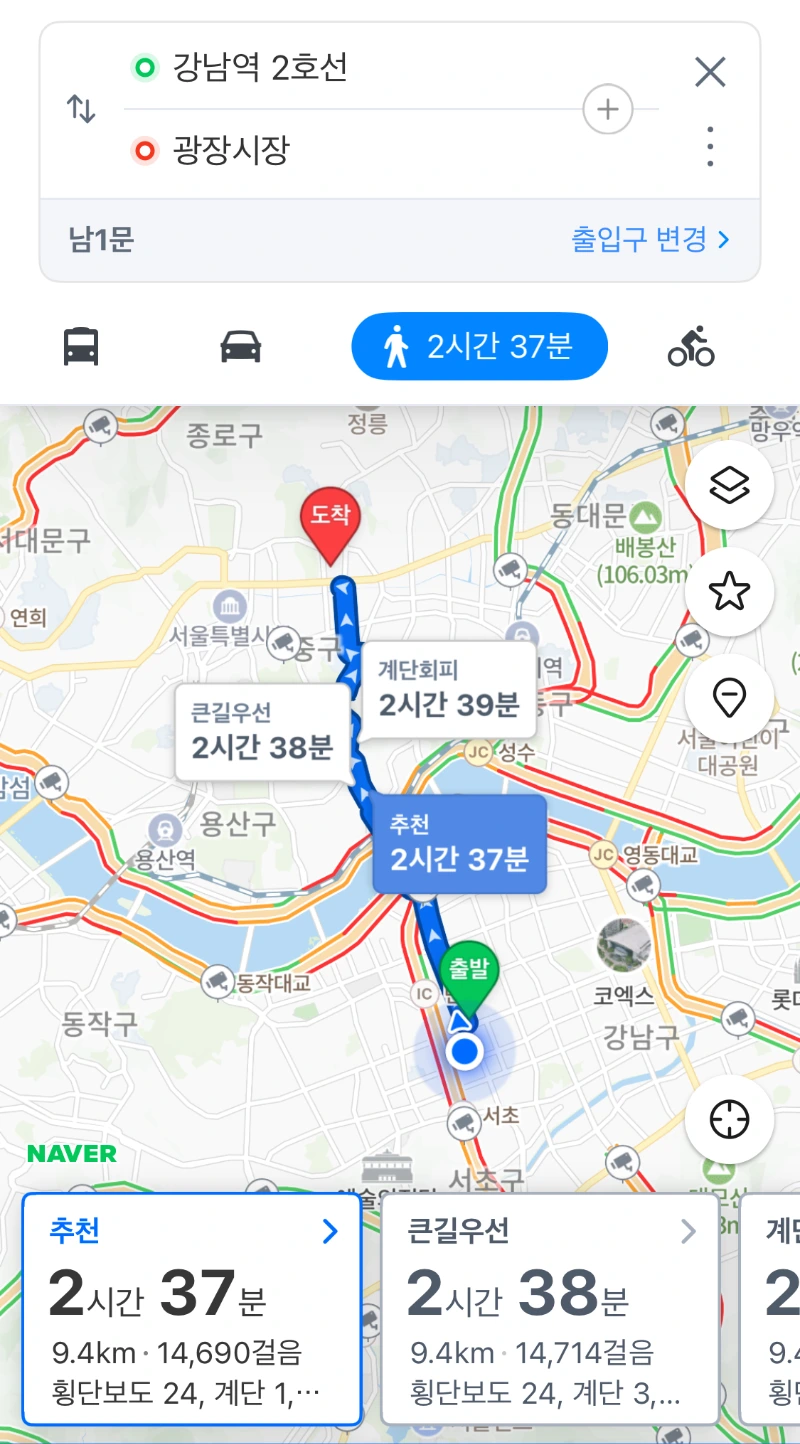 마음이 동했으니 가보자. 대중교통 대신 두 발로 도시를 느껴보자. 지도를 찍어보니 9.4km, 대략 세 시간 정도 걸리는 만만치 않은 여정이다. (좀 걷다 보니, 이제 네이버 지도로 조회해 보면 오차를 포함해 거리와 소요시간이 대충 짐작 가능하다. 이것도 일종의 성장이라면 성장이겠지.)