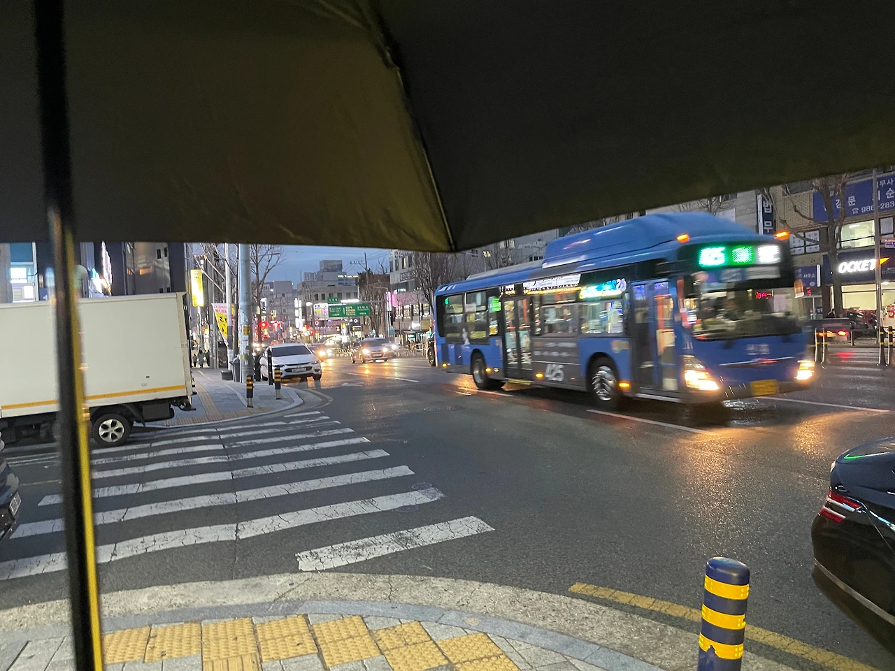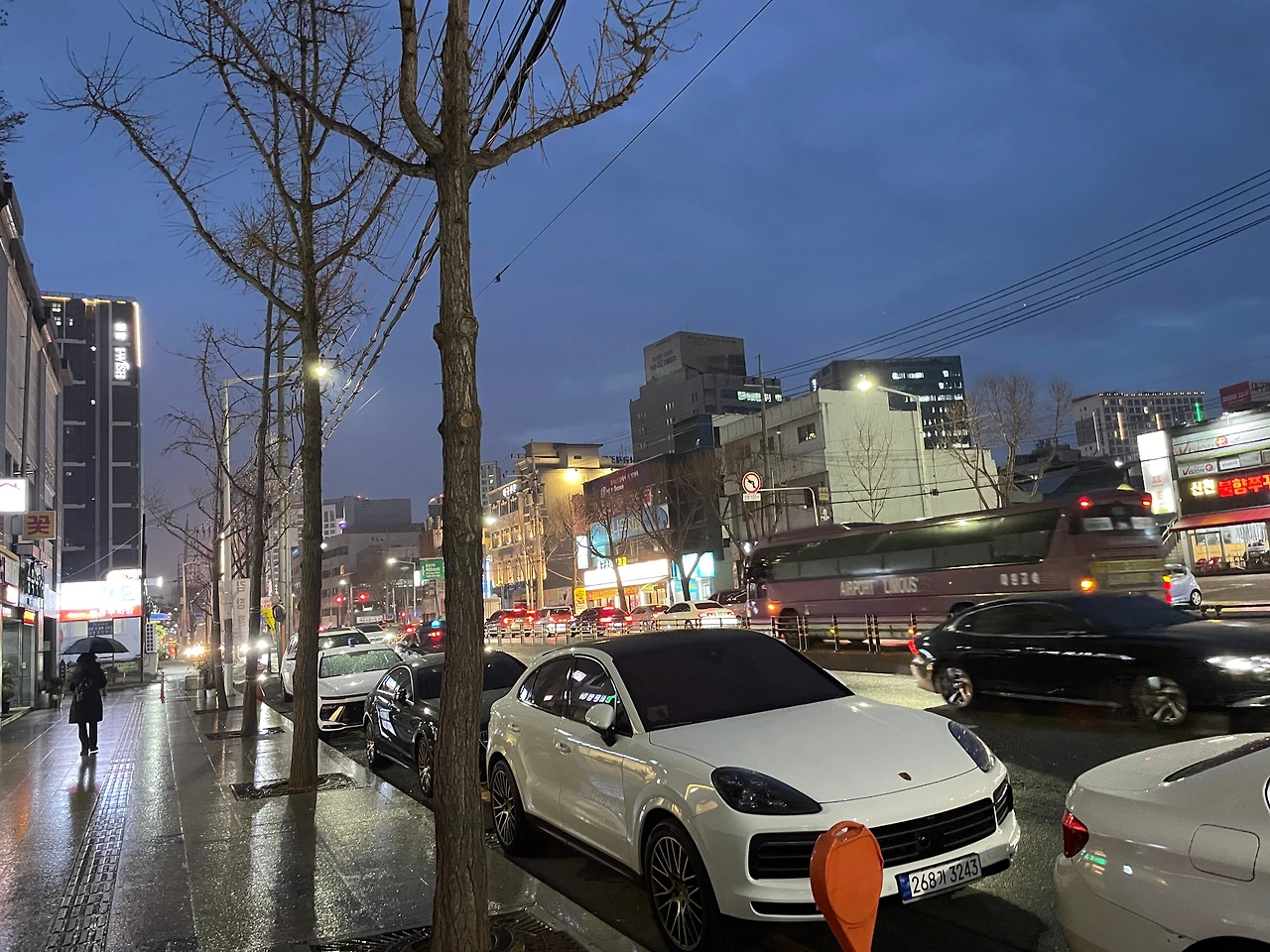 비 내리는 대구의 밤거리. 젖은 아스팔트 위로 비치는 네온사인. 우산을 쓰고 걷는 사람들. 빗물에 젖은 거리가 한 층 더 운치 있다.