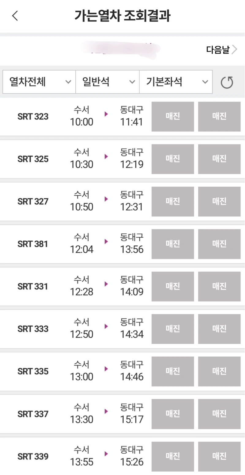 아오, 역시 인생은 시트콤이다. 쉽게 풀릴 리가 없지. 그렇다고 여기서 포기하고 집으로 돌아갈 순 없다. 대합실 의자에 일단 앉았다. 앱을 열었다. 당연히 화면엔 '매진' 글자만 가득하다. 오기가 생긴다. 될 때까지 해보자.