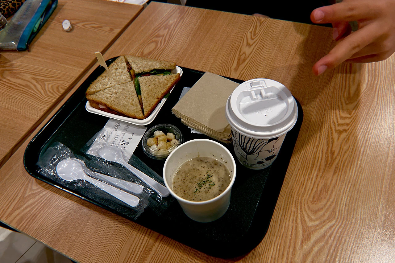 우리도 샌드위치와 따뜻한 스프, 커피를 주문했다. 사람이 많아서 주문이 밀려있나 보다. 나오는데 한참 걸렸다.