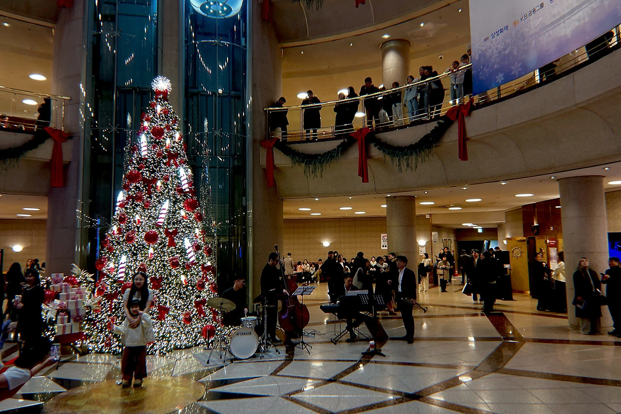 높은 층고의 넓은 홀 중앙에는 어김없이 거대한 크리스마스트리가 위용을 뽐낸다. 그 옆에서는 작은 로비 콘서트가 열려 사람들의 발길을 붙잡는다. 현악기의 캐롤 선율이 공간을 채운다. 저 밖 도시에서는 느낄 수 없는, 들뜬 연말 분위기가 가득하다. 트리 위 반짝이는 오너먼트와 사람들의 행복한 표정, 그리고 음악이 어우러진 이 풍경만으로도 오늘의 티켓은 충분히 값어치를 했다.