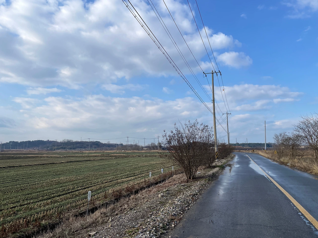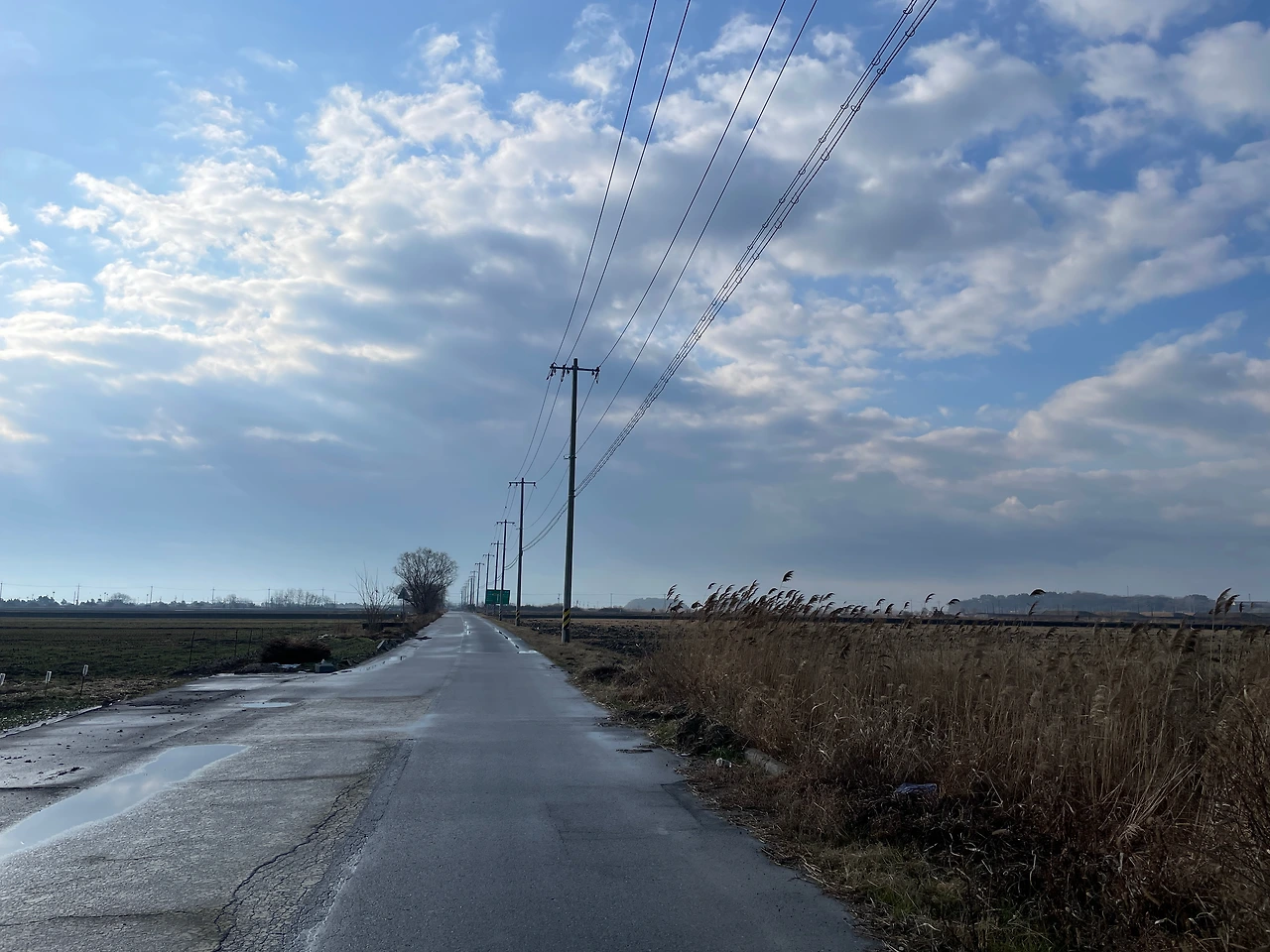아스팔트 위로 이런 길이 끝없이 계속된다. 40분 넘게 걷는 동안, 길 위에서 사람 그림자 하나 마주치지 못했다. 내 발소리와 바람 소리만 들린다. 이어폰이 필요 없는 눈과 귀가 정화되는 길이다.