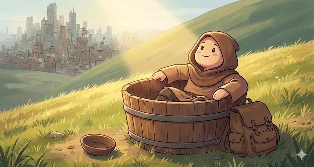 디오게네스는 '키니코스 학파'의 대표적인 인물로, 평생을 커다란 항아리 속에서 살며 소유를 최소화했다. 그와 관련된 유명한 일화가 있다. 세계를 정복한 알렉산더 대왕이 그를 찾아와 "원하는 것이 있다면 무엇이든 말하라"고 했을 때, 디오게네스는 대답했다. "햇빛을 가리고 있으니 옆으로 좀 비켜주시오." 왕이 줄 수 있는 그 어떤 보물이나 권력보다도, 지금 자신에게 내리쬐는 자연의 햇살 한 줄기가 더 소중하다는 선언이었다. 그는 인간이 외부의 조건에 휘둘리지 않고 스스로 만족할 수 있을 때 비로소 신적인 경지에 다다를 수 있다고 믿었다. 그는 심지어 유일한 소유물이었던 바가지조차, 손으로 물을 떠 마시는 어린아이를 보고는 "아이가 나보다 더 지혜롭구나"라며 던져버렸다고 전해진다. 가히 미니멀리스트의 끝판왕이라고 불릴 만하다.