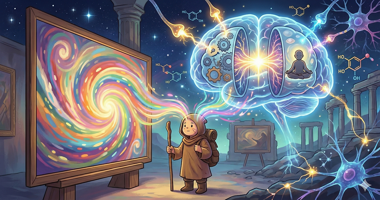 하지만 최근 신경미학 연구에 따르면, 우리가 예술 작품을 보고 감동을 느낄 때 이 두 가지 상반된 뇌 상태가 동시에 활발하게 연결된다고 한다. 작품을 해석하는 외부 지향적인 뇌와, 그 해석을 통해 나를 성찰하는 내부 지향적인 뇌가 만나는 것. 기적 같은 일이다. 이는 곧 나와 세상이 하나가 되는 '물아일체'의 경험이다. 깨달음의 경지에 오를 때만이 도달할 수 있는 지점이다. 예술은 그걸 가능하게 해 준다.