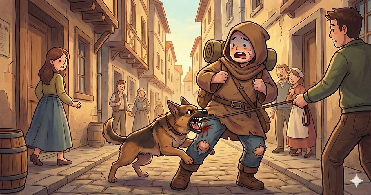 물린 다리의 청바지는 찢어졌다. 바지를 올려보니 개 이빨 자국 사이로 붉은 피가 배어 나왔다.