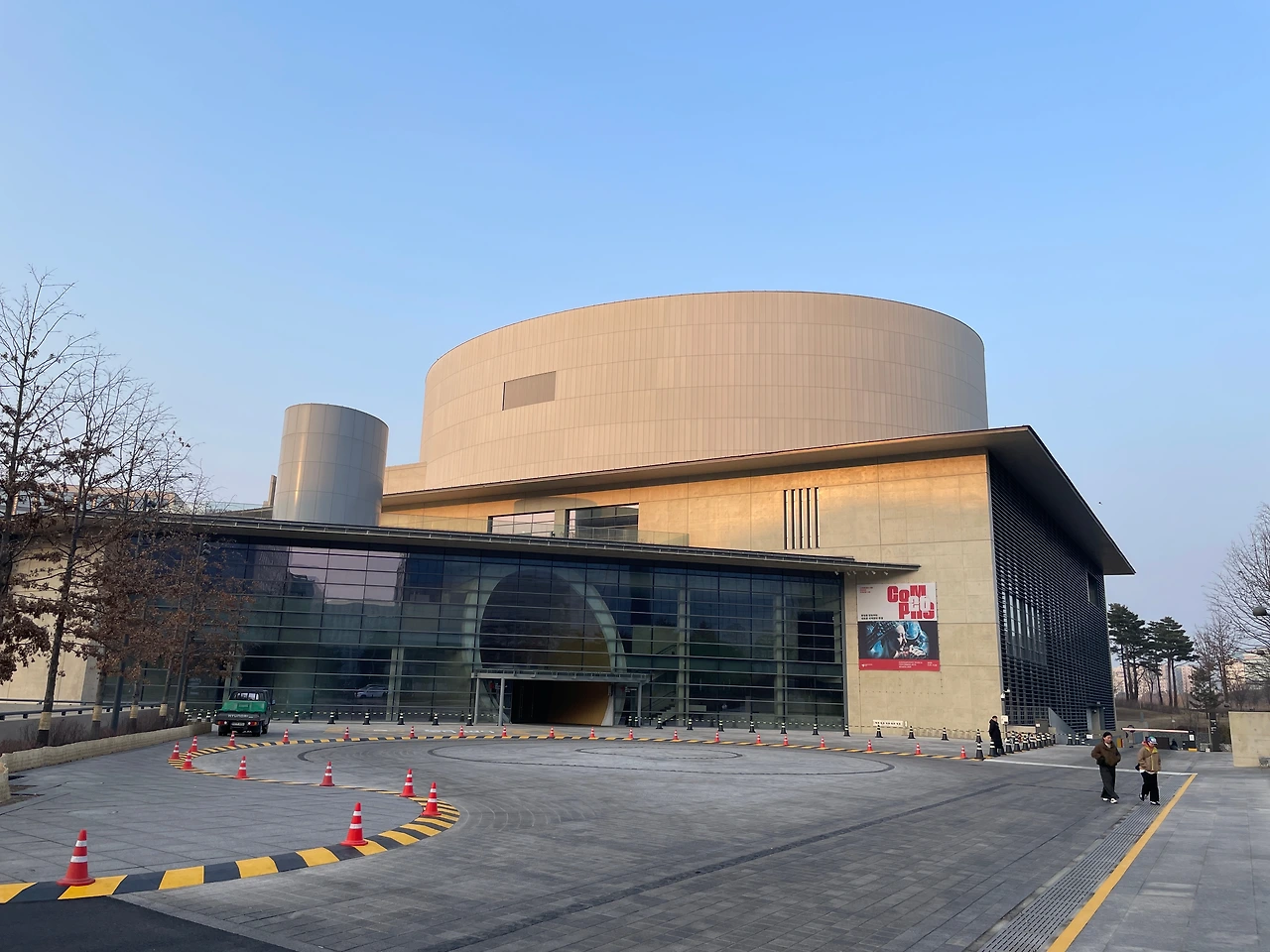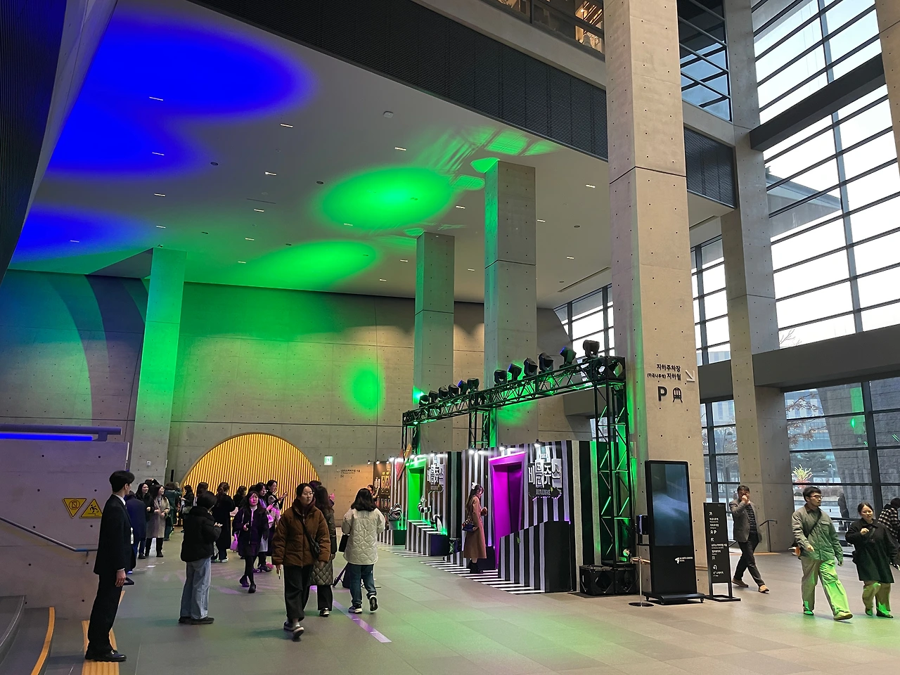 공연장 앞은 포토존이 설치되어 있었다. 건물과는 좀 어울리지 않는다. 애초 설계에 이런 화끈한 조명은 예상되지 않았을 테니.
