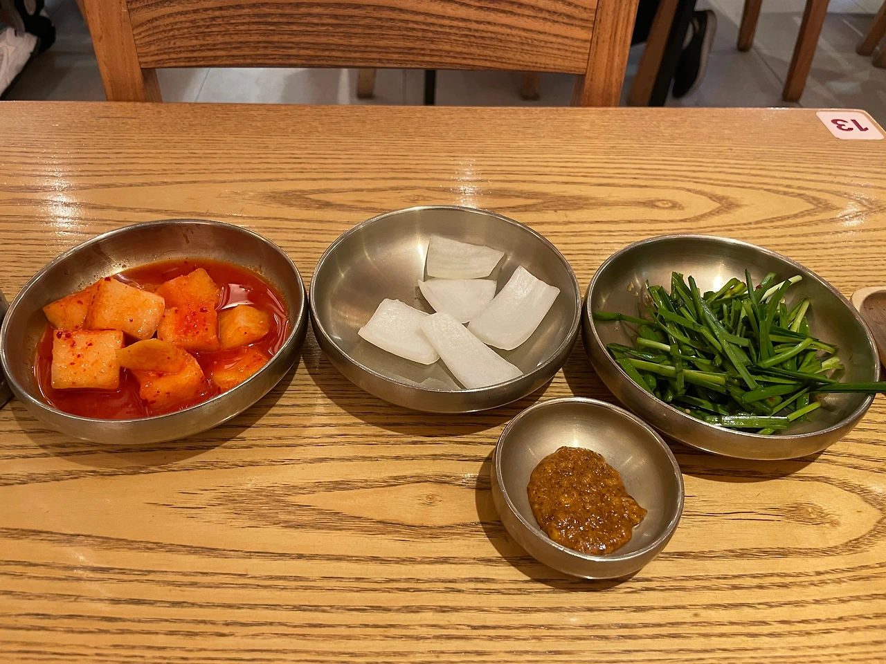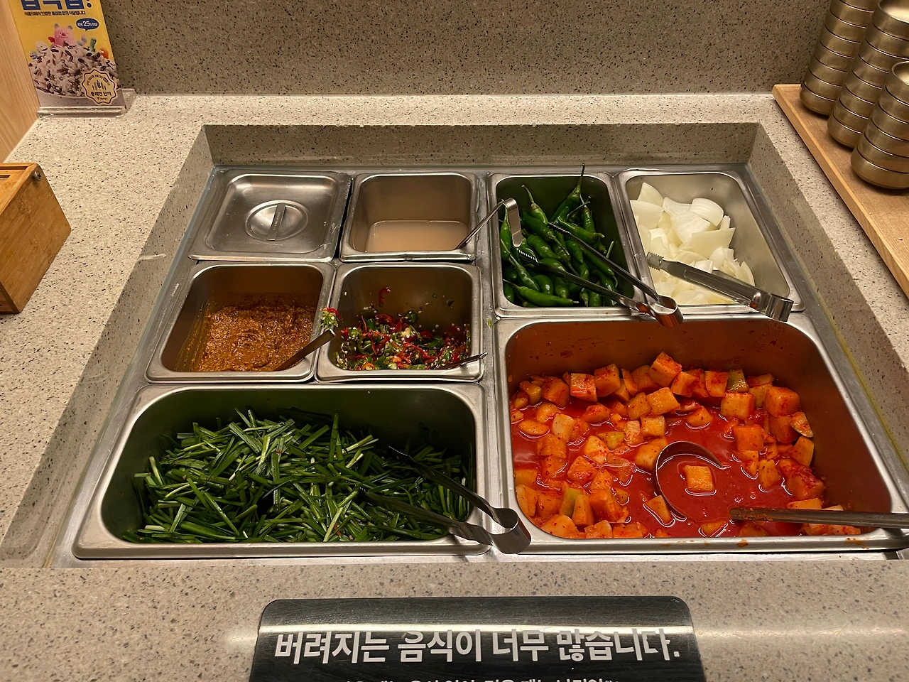 반찬이 떨어지면 직접 리필존으로 가면 된다. 시스템이 잘 갖춰져 있다. 나는 양파를 잔뜩 가져왔다. 국밥의 기름진 맛을 잡아주는 데는 양파, 마늘만 한 게 없지.