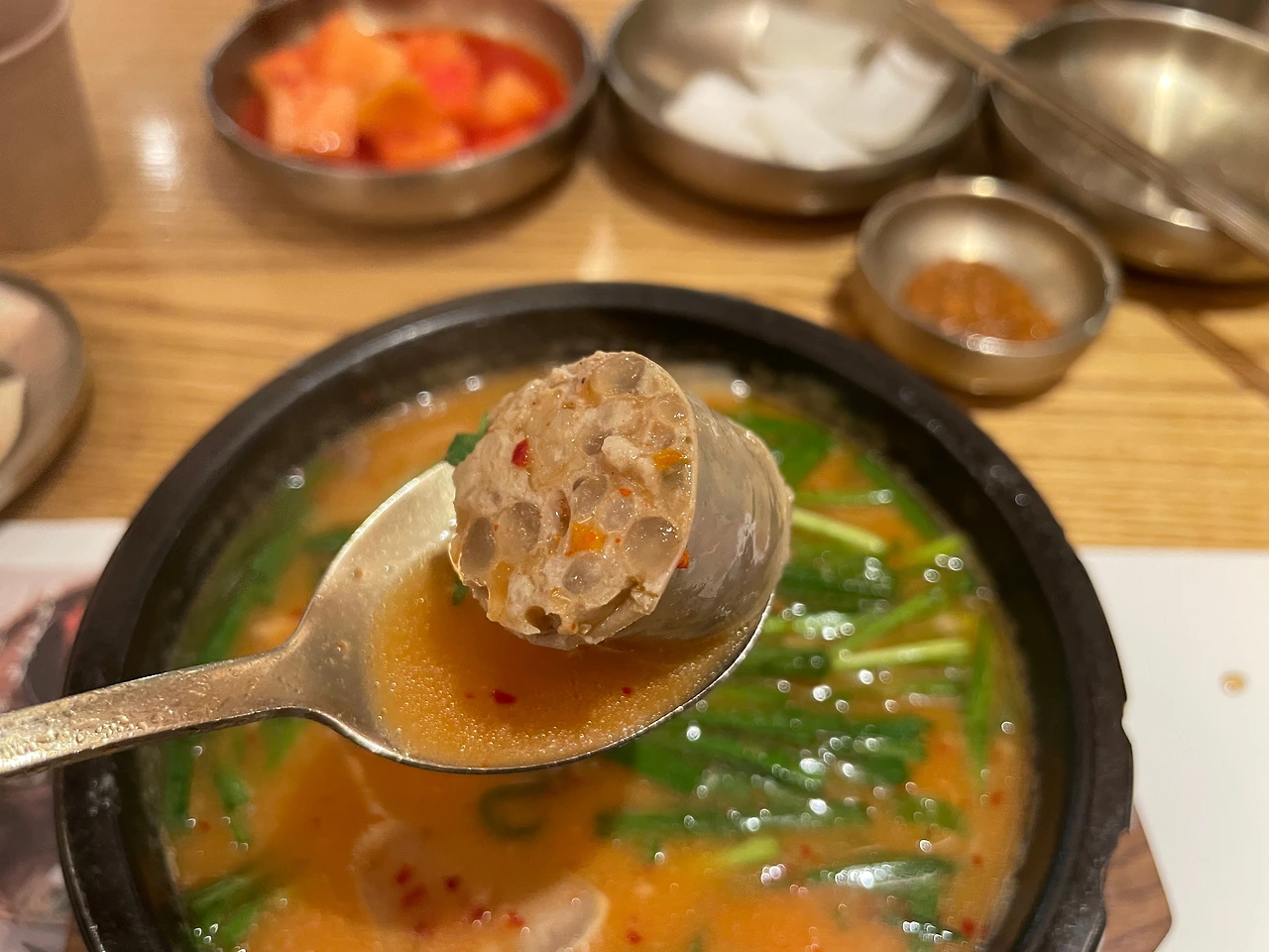 순대는 예상대로 일반 당면 순대가 아니다. 선지와 고기(?)가 꽉 찬 진짜 순대다. 근데 이 순대 어디서 맛본 느낌인데, 아 이거 소시지 맛이다. ㅋㅋ 소시지 맛이 난다. (장점이라고 봐야 하는 걸까.)