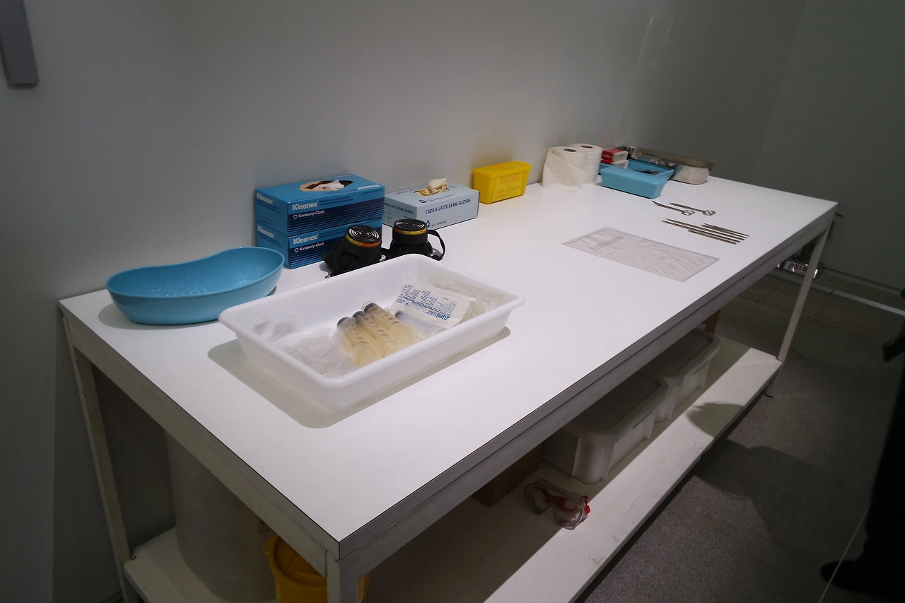 수천 개의 알약이 줄지어 도열한 선반 앞을 지났다. 데미안 허스트가 약에 집착하는 이유는 현대인이 종교 대신 과학과 의학을 맹신한다는 점을 꼬집기 위해서라던데. (종교 맹신은 괜찮고?) 약이 우리를 구원해 줄 것이라는 믿음이 강하기 때문인 것 같다. 그렇게 몰핀에 중독되고, 인간은 서서히 약에 의존하게 되었다. (미국의 현재 상황을 보라.) 전시된 메스나 의료기기 역시 같은 맥락의 도구들로 보인다. 결국 인간은 무엇에라도 의지해야만 죽음의 공포를 견디는 존재인가 보다.