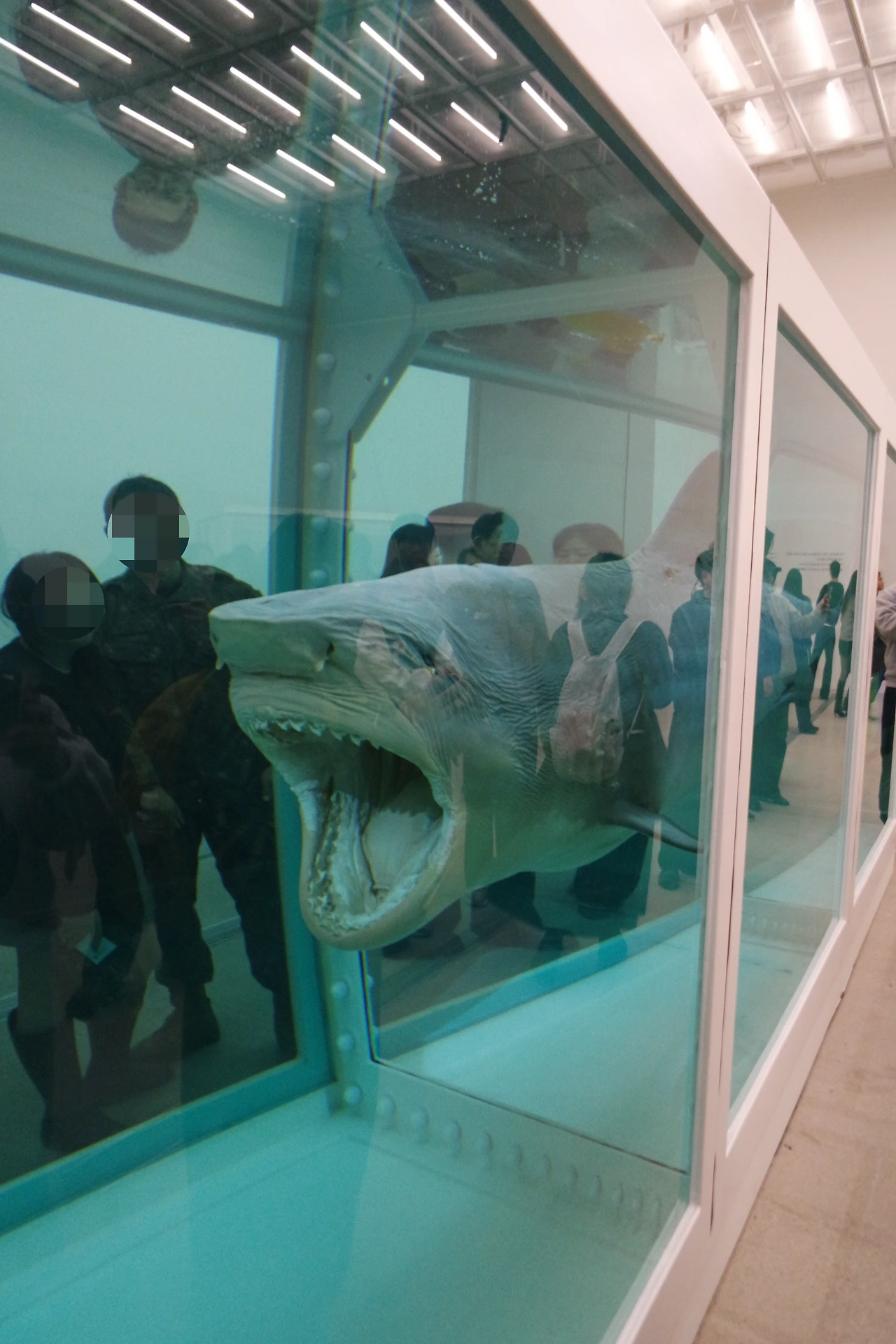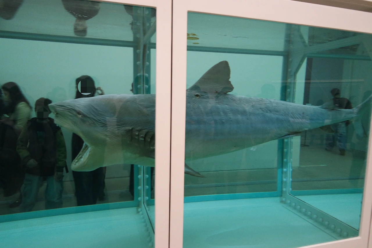 드디어 그 유명한 상어와 마주했다. 제목은 <살아있는 자의 마음속에 있는 죽음의 물리적 불가능성>이다. 거대한 포름알데히드 수조 속에 갇힌 죽은 상어는 삶과 죽음 그 사이 어디쯤에 있어 보인다. 기묘한 생동감을 뿜어낸다. 입을 쩍 벌리고 있어서 그런가 싶다. 죽음을 박제함으로써 역설적으로 삶의 유한함을 들춰내는 방식이다. (죽음은 멀리 있지 않다. 바로 옆 수조 속에 있을 뿐.)