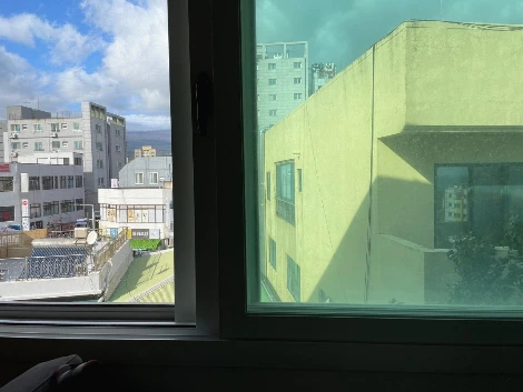 혹시나 '헤이, 서귀포'에 묵으실 분들을 위해 한가지 정보를 드린다면. 지금 사진에 보이는 건물은 바다를 향하고 있다. 그래서 무조건 오션뷰를 배정받을 것이라고 착각할 수 있다. 하지만 저 건물 뒤에 오래된 건물이 하나 더 있다.(함정?) 그 건물에 묵을 가능성이 있다. 뒷편 건물의 객실 분위기나 상태는 오래된 모텔을 개조(?)한 느낌이다. 잘 알아보고 예약하시길 바랍니다.